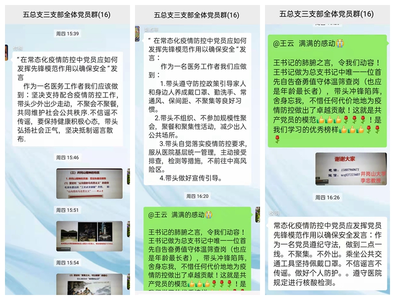 面对当前疫情防控形势,为统一思想、坚定信心、坚持不懈地做好疫情防控各项工作,3月31日至4月1日,第五党总支第三党支部在支部党员微信群中围绕“扬正气、做模范”,开展了“我是党员我带头,防控疫情当先锋”的主题党日活动。