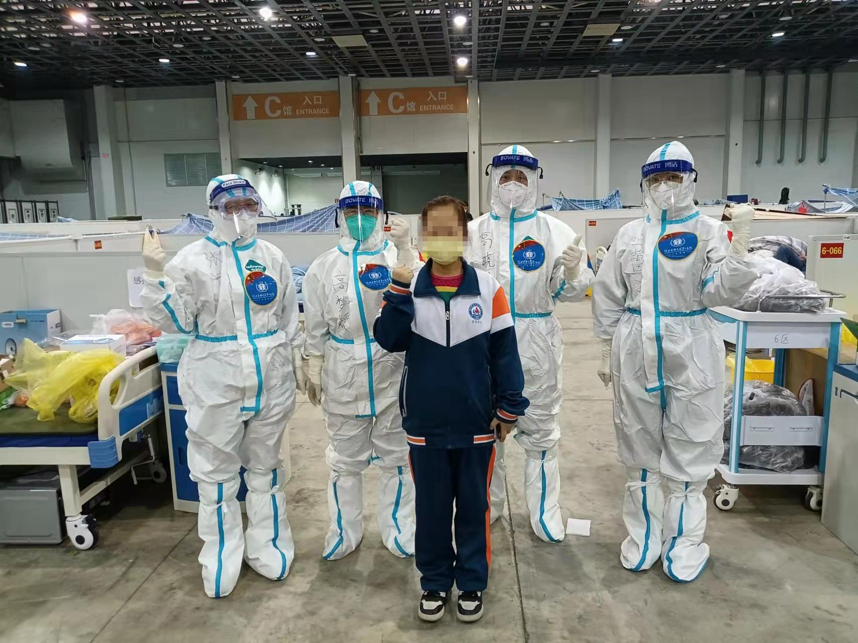 除了李萍护士长,这次出征的还有许多护士长和老师,她们有着多年的护理经验,正因这些“老”老师做出表率,在方舱护理工作中出谋划策,我们才能迅速展开护理工作并取得显著成效。舱内工作多而琐碎,舱内多数是无症状及轻症病人,肝胆外科许志娟老师充分评估患者情况后,积极与患者沟通,询问意愿,组建了第一批病区志愿者,更好的了解并解决了患者的实际困难,而且提高了工作效率,大大降低了院感风险;急诊科高梦颖老师,发挥自己的专业特长,从连接线路、安装电池到调试、备用,保障了舱内急救设备正常运转;核酸采集是舱内护理工作重要的一项,呼吸科的刘桂森老师主动组织大家进行学习,并对流程进行规范,保证采集的规范和护理人员的有效防护;妇科的刘淳老师,勇于担当,毫不计较,不仅精心指导技术,在队员情绪有波动时主动给予包揽疏导,减轻压力。身心医学的李铃干活利索,善于沟通,看到孩子们喜欢聚集,为了防止交叉感染,她组织孩子参与志愿者活动,帮助分发口罩、收拾垃圾等,并在活动后给予玩具、牛奶等奖励,深得孩子们的喜爱;侯冬藏老师工作中积极热心,主动承担患者正确佩戴口罩等健康宣教工作,并担任运动教练,带领患者在舱外进行健走行动,强身健体,放松身心。