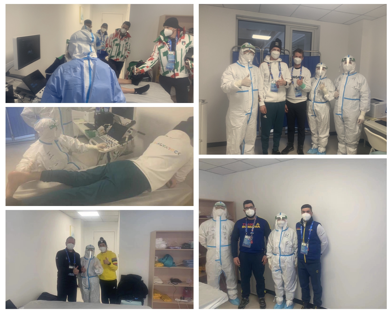 综合诊所正式开诊后,超声科的老师们立即投入了紧张的工作。张家口冬奥村是本届冬奥会最大的奥运村,综合诊所将为两千余名运动员及随行官员、四千多名工作人员提供医疗保障服务。工作人员身心的劳累以及各国运动员在训练和比赛中的受伤,使得就诊患者超声检查需求量很大。除了每日预约患者,还会有不定时的急诊呼叫。不论是风雪交加的深夜还是寒风刺骨的凌晨,急诊电话一响,“超人”们立即穿好隔离服,做好防护赶往诊室。他们克服了语言沟通的难题,一次次帮助患者做出准确的诊断报告,每次诊疗结束后得到运动员和随行队医的肯定,对他们就是莫大的鼓舞。