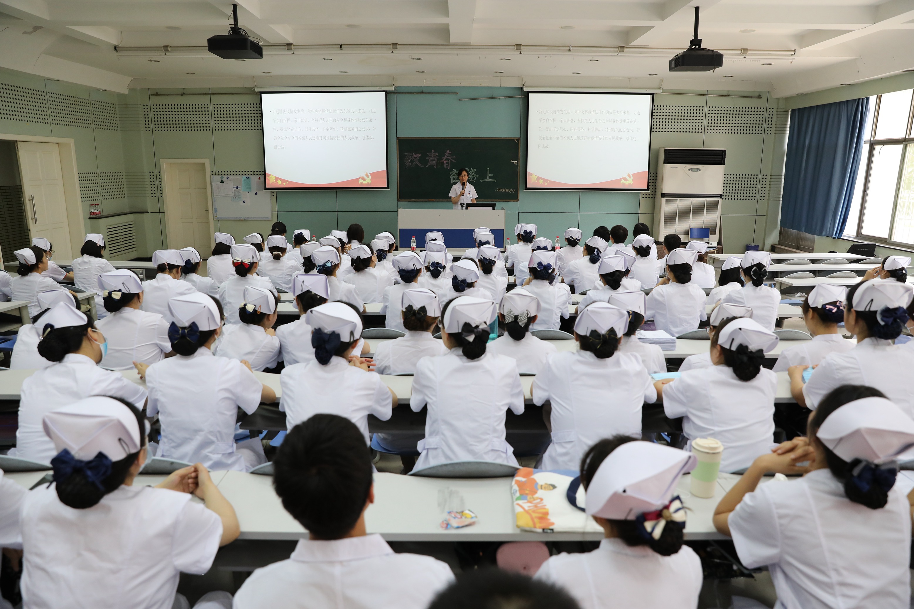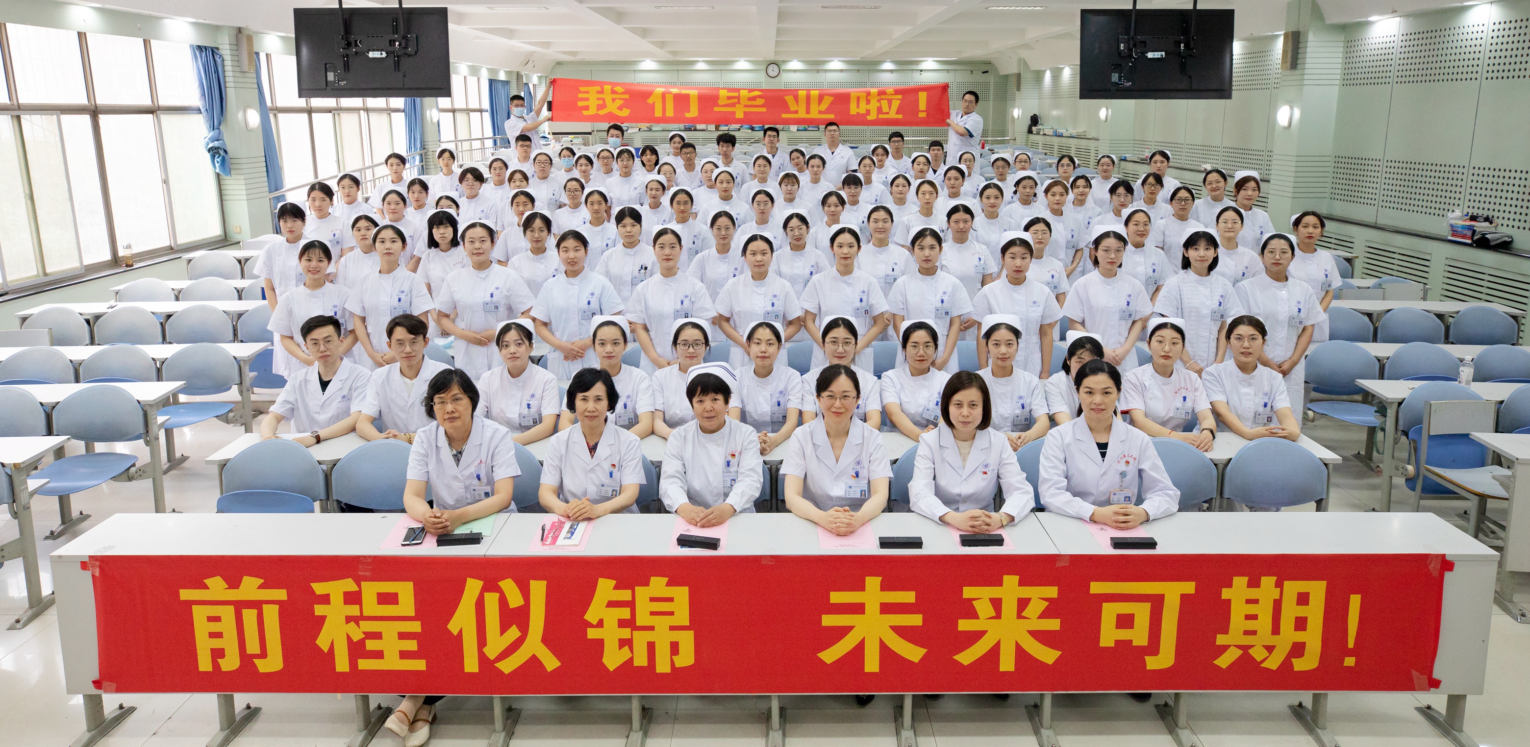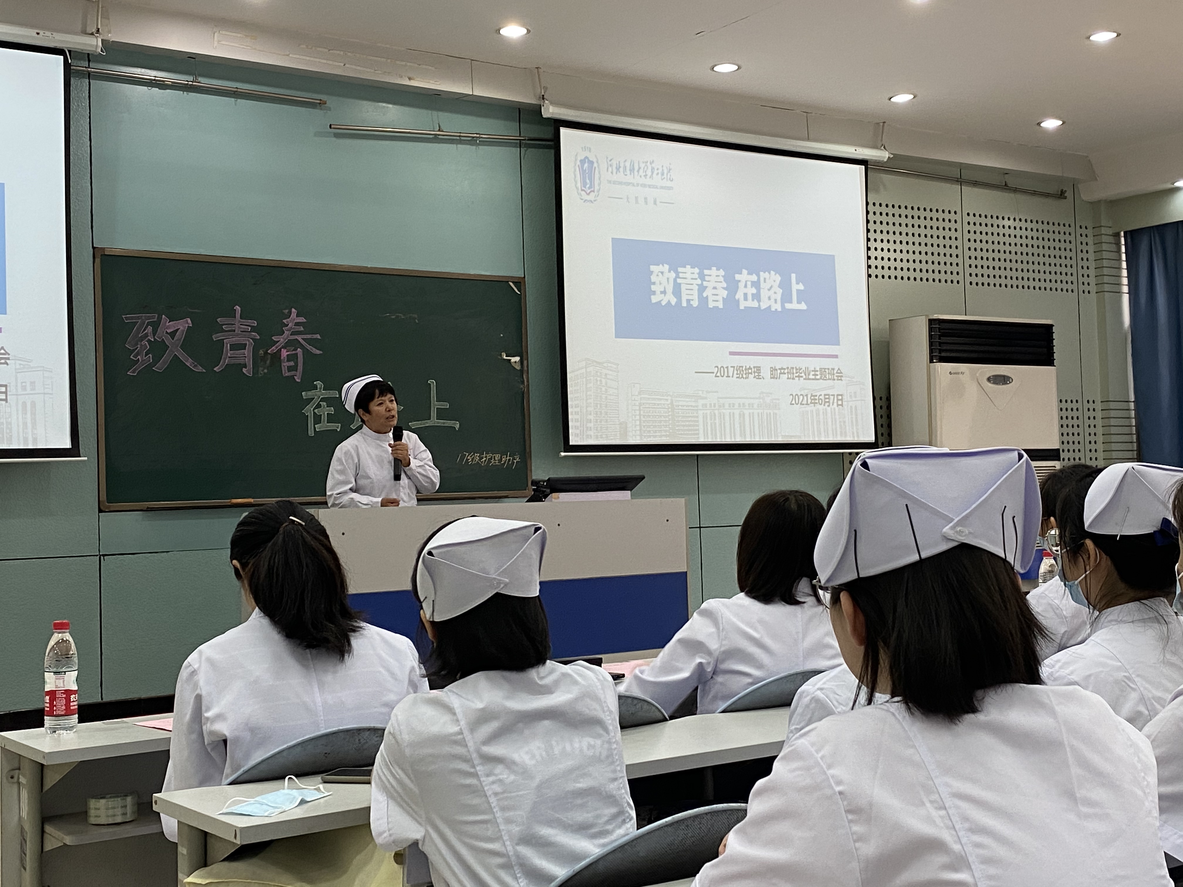 6月7日护理、助产专业2017级“致青春、在路上”毕业主题班会在教学楼一阶梯教室举行。名誉班主任、学校护理学院副院长、医院科研处处长赵滨老师;学业导师、内科护理学教研室主任,大内科护士长何文英老师以及教务处领导老师们参加了本次主题班会。