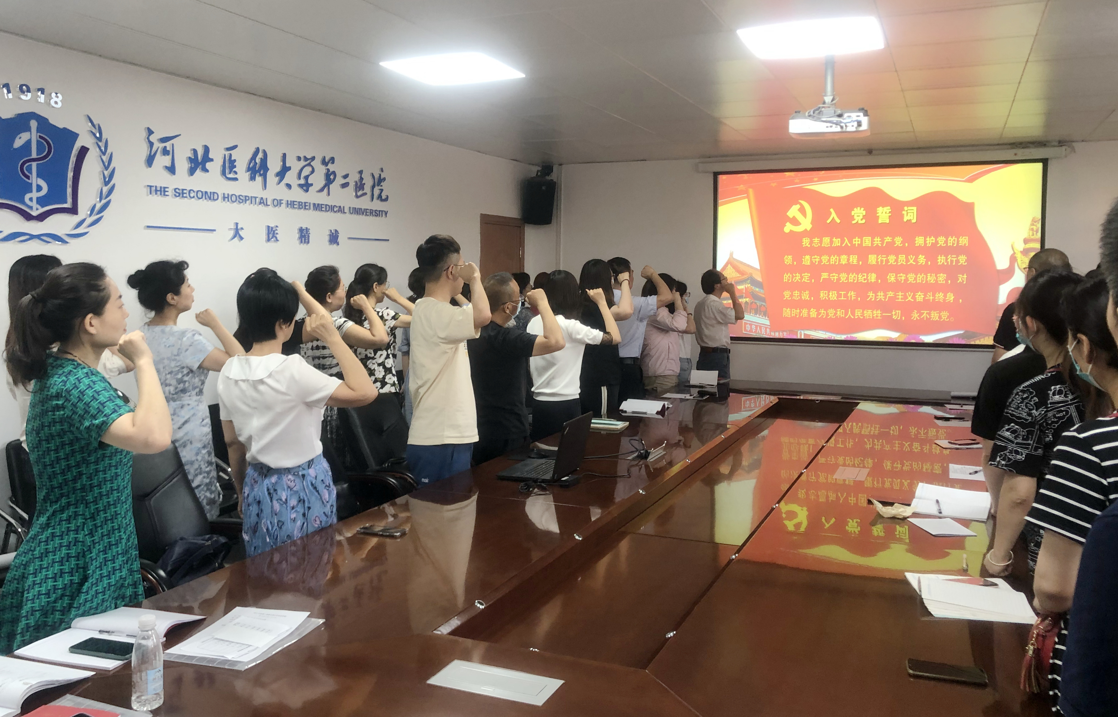 全体党员包括12名新党员胸前佩戴党徽,面对鲜艳的党旗,在支部书记刘力宏带领下,再一次举起右手,庄严宣誓,重温入党誓词。铮铮誓言,既是每名党员的初心使命,也是为之奋斗的最高目标和不竭动力,激励大家不断进取,自觉奉献,为党的伟大事业奋斗终生。