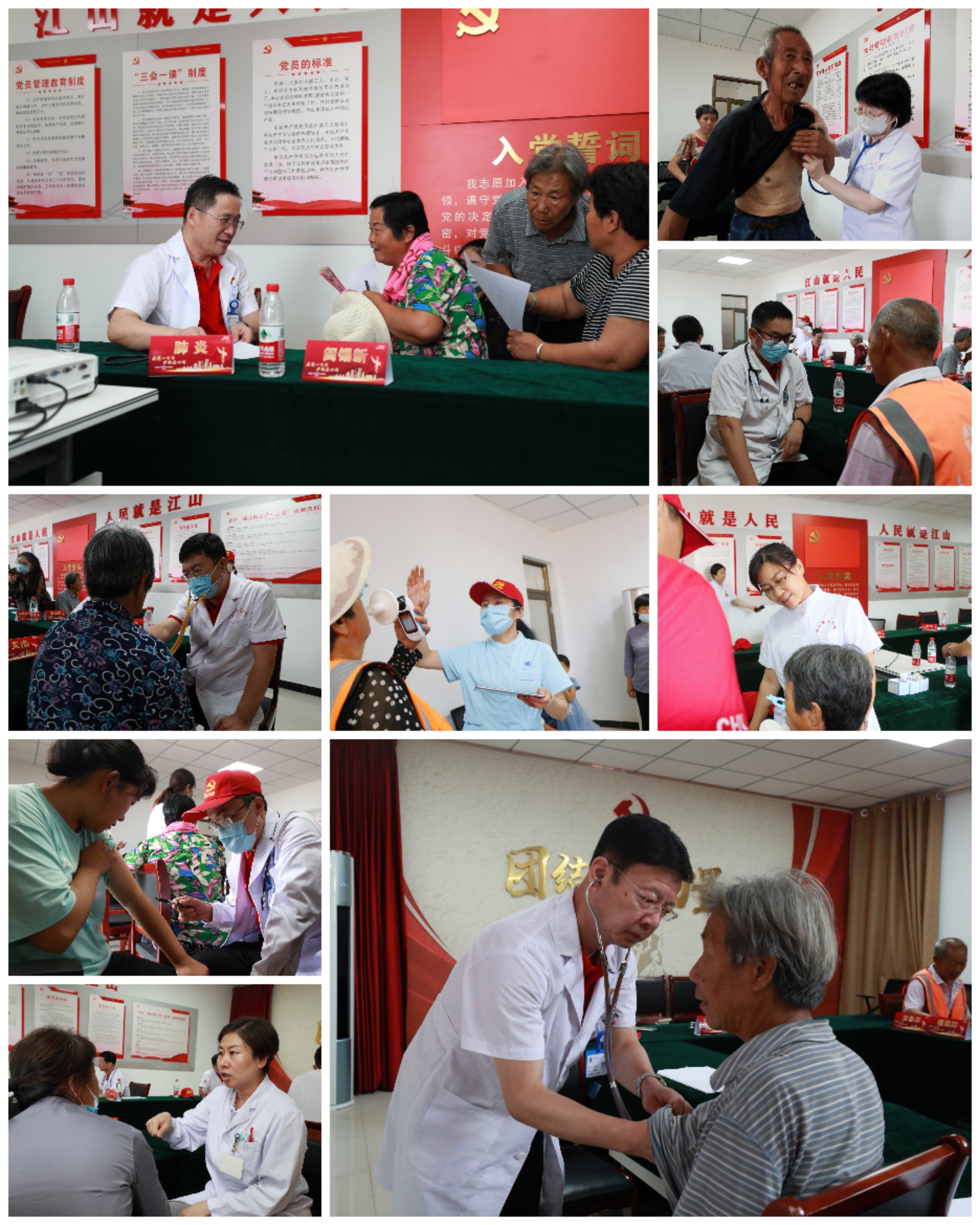 下午,参观结束,党员同志们来到了北庄村,“团结就是力量,团结就是力量,这力量是铁,这力量是钢......”这首歌是从平山县西柏坡镇北庄村唱起并传诵至今。在这里组织《团结就是力量》为主题的支部座谈会,意义重大。党员同志们畅所欲言,发自肺腑,形成共识,将力量转化为护佑患者为己任的实际行动。党员医生们耐心对待每一位前来义诊的病人,询问患者病史、详细检查、细心诊治,并及时提出治疗建议和用药指导。除为各类疾病进行初步筛查、诊断外,还提供健康指导服务。党员护士们为群众免费提供血压、血糖测量、肺功能检测等。医护党员们为老区人民大家感受到了老区人民谦虚朴实、团结互助的民风,也充分体会到了当地党群干群的融洽。通过与镇党委及村委会联动,共同夯实了“我为群众办实事”实践活动。