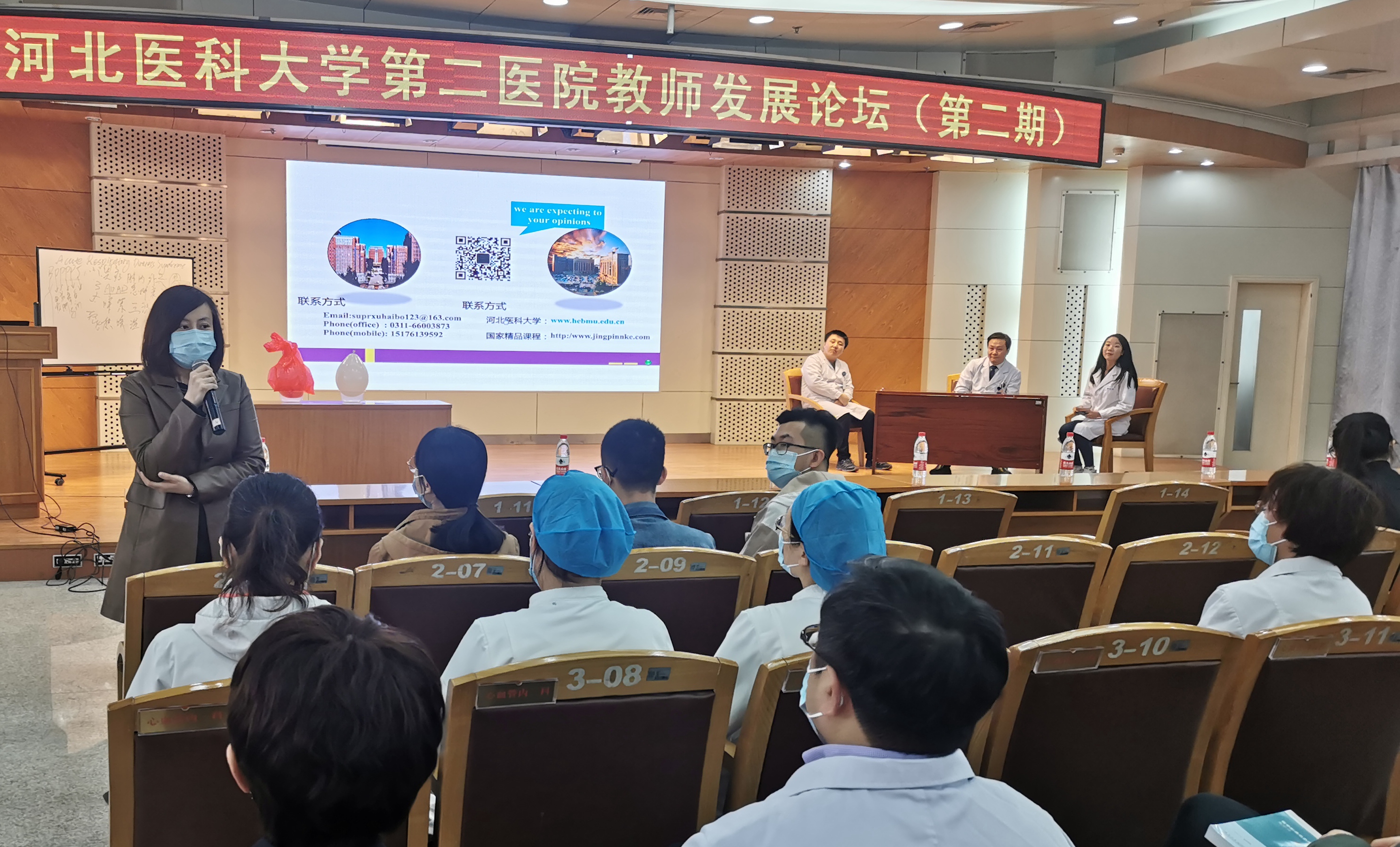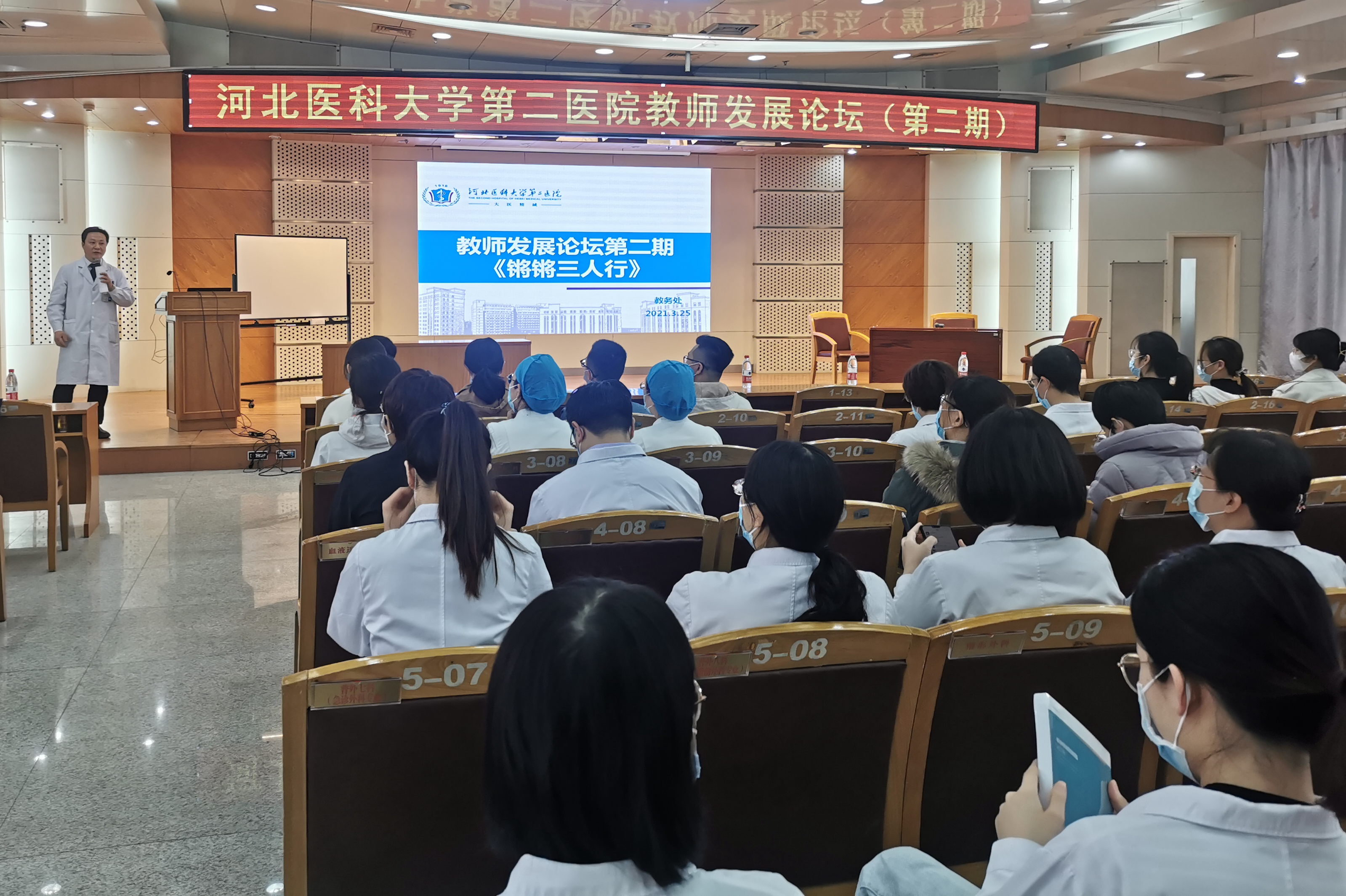 3月25日下午,教务处在图书馆三楼成功举办教师发展论坛第二期《锵锵三人行》,邀请血管外科、第八届全国高等医学院校青年教师基本功比赛二等奖获得者高翔老师,呼吸一科、第八届全国高等医学院校青年教师基本功比赛二等奖获得者徐海博老师和16级儿硕班班长、全国生长发育专业医师科普大赛河北省第一名获得者邢雨彤同学同台展示,教学督导组、心血管内科专家郝玉明教授现场点评,为150余名教师带来一堂别开生面的示范课。本次活动由教务处副处长郑雅梅主持。