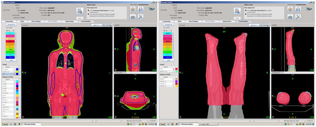 该患者是血液科一位拟行骨髓抑制治疗的急性髓系白血病患者,此次Tomo全身照射(Total Body Irradiation, TBI)是在造血干细胞移植前行全身照射预处理,预处理后的患者,治愈率更高,复发率更低。但Tomo TBI技术复杂,实施难度高,尤其是前期工作量巨大,工作人员需全身的精准定位、全身区域和特殊保护区域和器官的靶区勾画,复杂庞大的放疗计划设计以及实施过程中高标准的复杂摆位,整个过程历时5天。在连续3天6次的Tomo治疗过程中,每天早晨和晚上各半小时的照射过程非常顺利,放疗科与血液科同仁们一起,加班加点,攻坚克难,开启了应用Tomo进行全身放疗(TBI)的新篇章。该患者目前情况良好,已顺利入仓,将按既定方案接受骨髓移植。