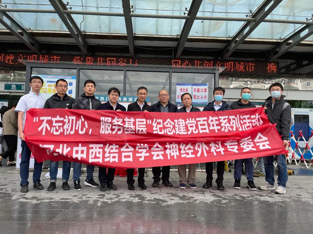 我院东院区神经外科党支部专家团于2021年5月17日奔赴河北省邢台市南和区,开展“不忘初心,服务基层”纪念建党百年系列活动。活动通过与邢台市南和区人民医院进行技术对接,就群众关心的健康问题及基层医院急需开展的项目和技术难点深入进行了交流,切实为群众办实事,以实际行动庆祝中国共产党成立一百周年。