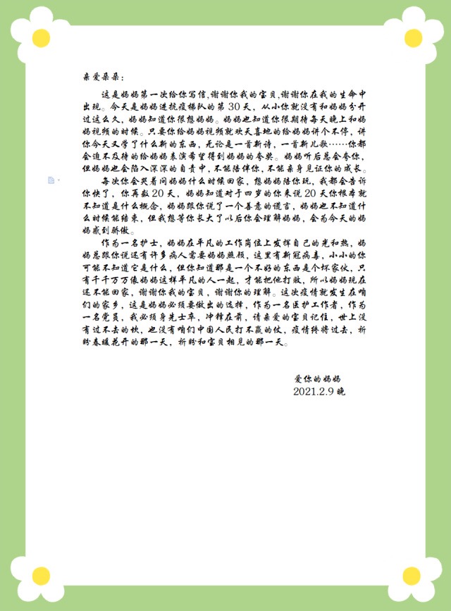 支援胸科医院医疗队王娟爱人与孩子的思念书信