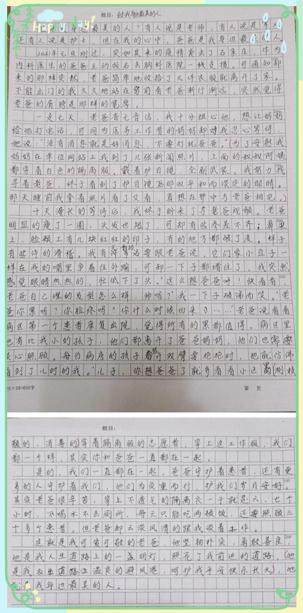 神经内科主治医师霍颖浩在支援胸科医院医疗队中工作,一连多天都在紧张的工作中,顾不上和家人联系。正在读初二的儿子霍弈铭每天都盼望着爸爸的电话能响起。得知爸爸过年也回不了家,孩子以文字寄托对爸爸的思念。