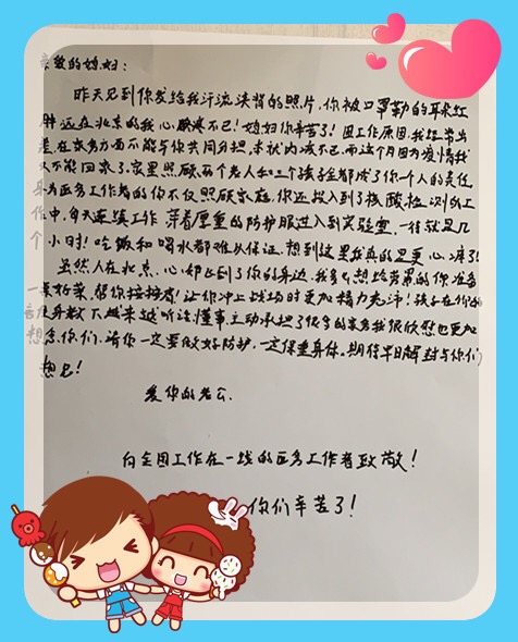 东院区的护士刘慧的老公因为疫情被迫在北京回不了石家庄,他给老婆写了一封饱含深情的信。