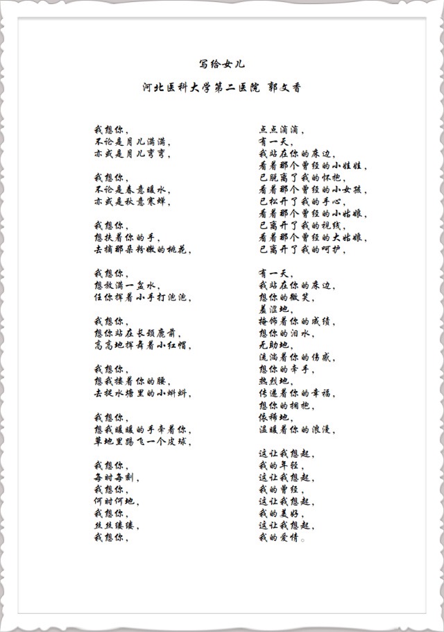 儿科郭文香副主任医师,则以题为“写给女儿”的散文诗,抒发对女儿的思念。