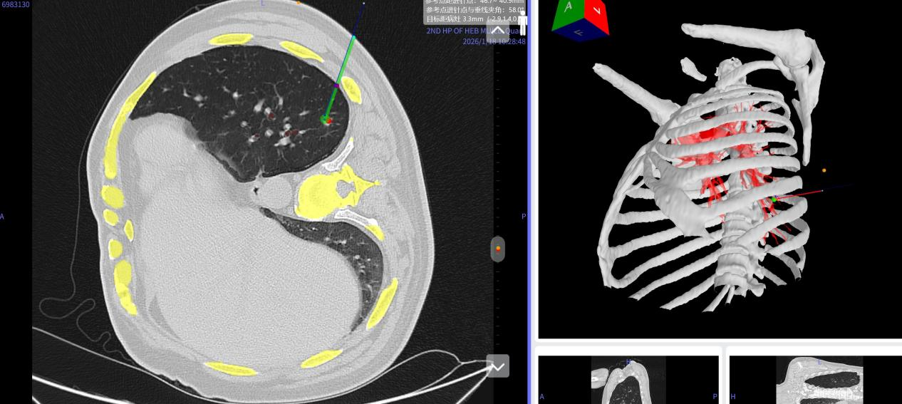 手术当日,患者接受全身麻醉后取侧卧位。李书军教授佩戴VR眼镜开始实施定位。在人工智能技术的驱动下,患者的肋骨、支气管、肺组织及血管等胸部结构,连同其呼吸动态,均以三维立体的形式实时呈现在视野中。