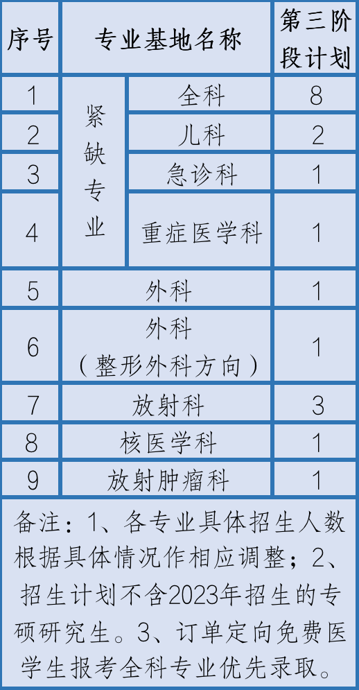 6、住院医师规范化培训培训时间为36个月。医学类专业学位研究生毕业人员或已在2级以上医疗机构相应专业执业工作时间满两年人员(不含并轨专硕生)参加住院医师规范化培训,经个人申请通过培训基地考核后可减少培训时间(最长不超过12个月)。培训减免后将不再享受中央和省级财政给予的相关补助。