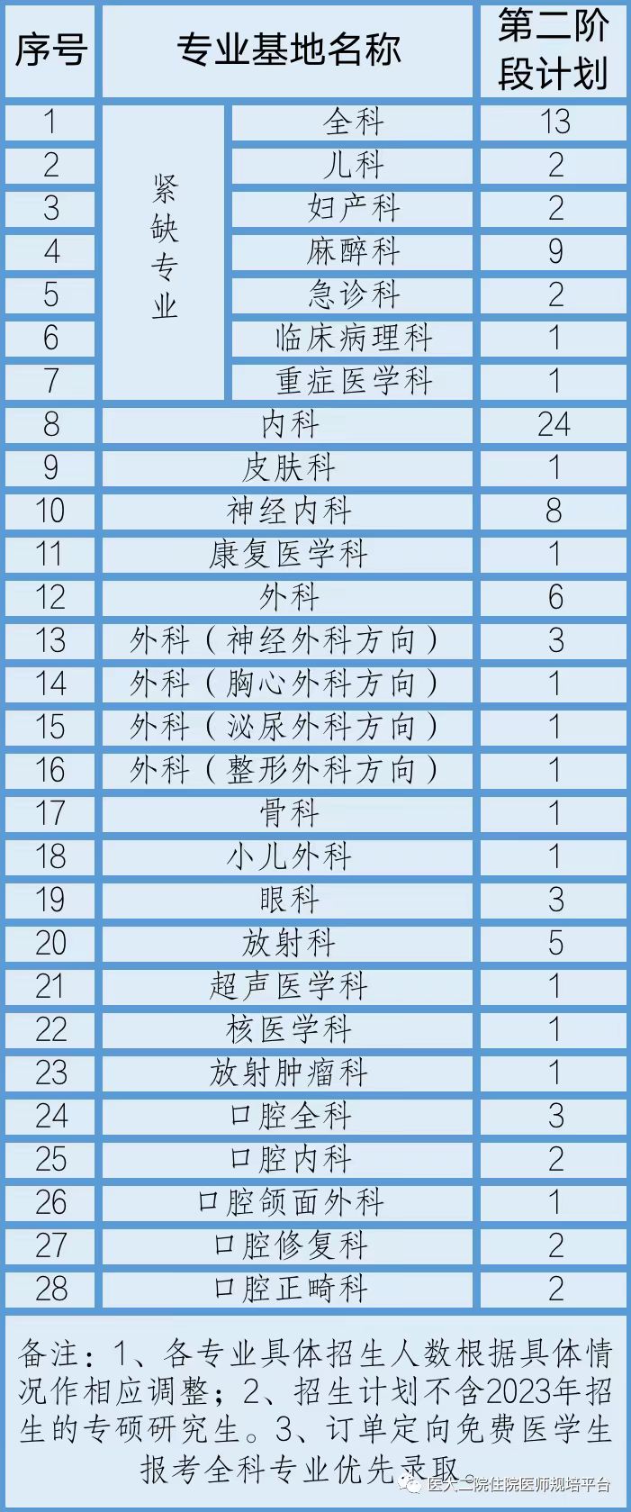 6、住院医师规范化培训培训时间为36个月。医学类专业学位研究生毕业人员或已在2级以上医疗机构相应专业执业工作时间满两年人员(不含并轨专硕生)参加住院医师规范化培训,经个人申请通过培训基地考核后可减少培训时间(最长不超过12个月)。培训减免后将不再享受中央和省级财政给予的相关补助。