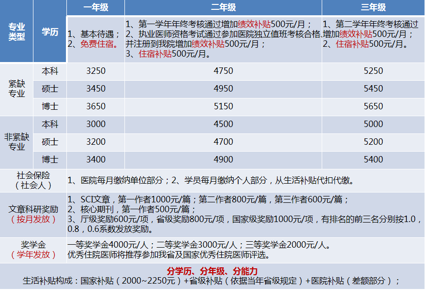 生活补贴由基本待遇、绩效补贴、其他奖励组成。对面向社会招收的住院医师及外单位委派住院医师,生活补贴如下: