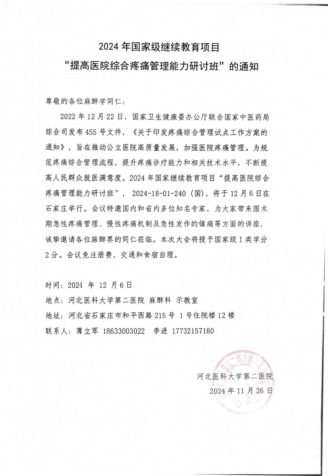 2024年国家级继续教育项目“提高医院综合疼痛管理能力研讨班”的通知