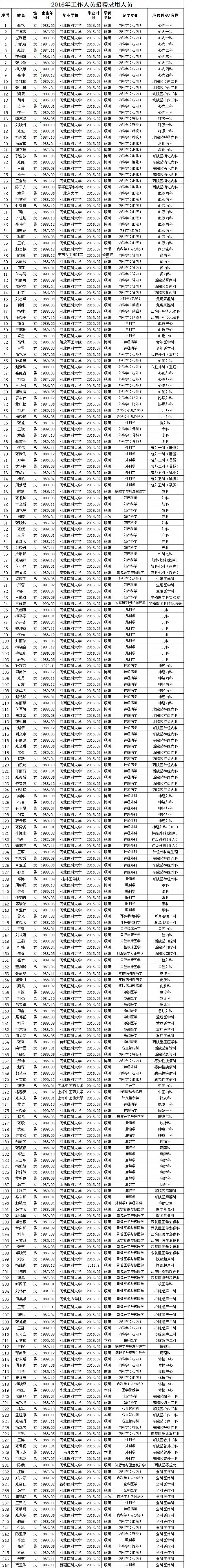 根据医院工作人员招聘计划,经对应聘人员进行考试考核,根据三个环节考试的分数,医院决定录用以下247人(名单见下表),请以下人员于9月3日(本周六)早7:30到医院体检中心查体。