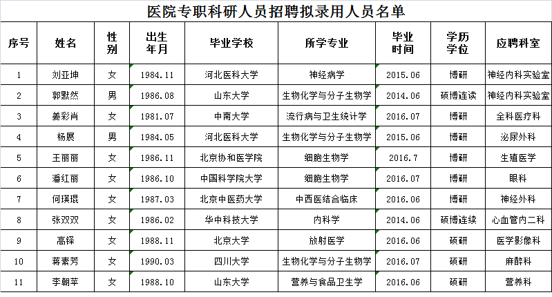 根据医院专职科研人员招聘方案,经对应聘人员的考试,根据考试结果医院决定录用以下11人(名单见附表),请以下人员于5月31日前到医院体检中心查体,2014、2015年毕业的于6月1日至医院人事处报到,2016年毕业的于7月6日报到。