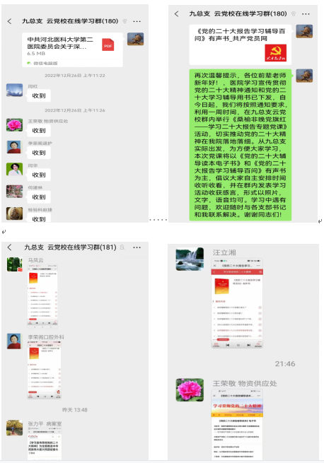 各党支部组织开展了“党的二十大精神大家谈”“学习党的二十大,我为科室建言献策”“援疆医务人员谈体会”“强国复兴有我”“学习二十大 永远跟党走”等主题实践活动,通过党员互动式讨论、党的二十大知识答题、手绘二十大、开展志愿服务等形式,深化学习成果、检验学习成效。