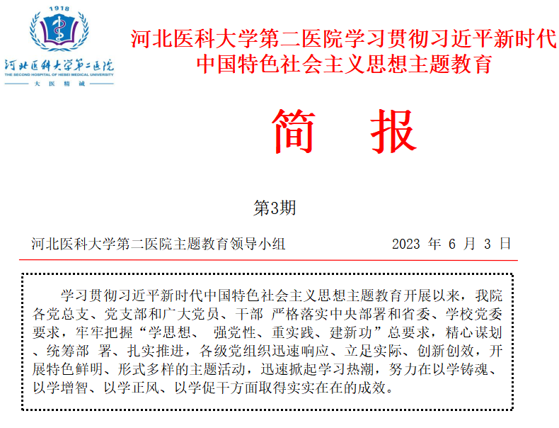 学习贯彻习近平新时代中国特色社会主义思想主题教育开展以来,河北医科大学各直属医院将提高医院医疗工作水平同主题教育紧密结合,在统筹谋划、顶层设计上下功夫,在补短板、强弱项上持续用力,多措并举出“实”招,医疗惠民见“实”效,让人民群众切实感受到解决问题的实际成效。