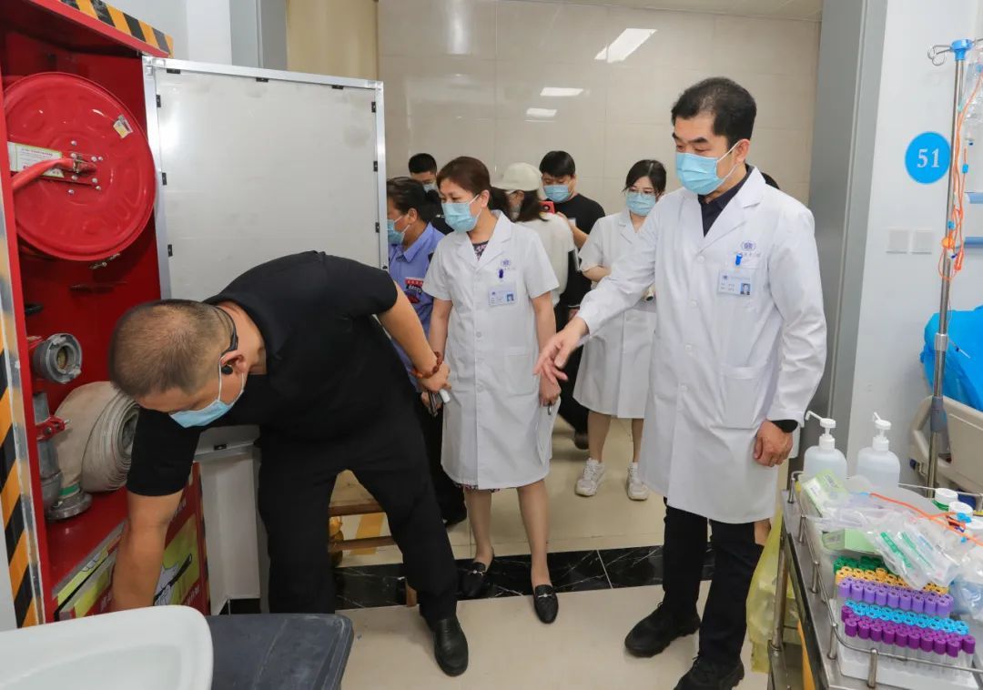 瞿院长一行深入学生宿舍、中心配电室、消防控制室、1号住院楼、2号住院楼、急诊科、施工现场、职工餐厅、科研楼、制氧站等重点区域部位,聚焦党建与业务工作深度融合,认真开展调查研究。瞿院长与科主任、护士长、在岗工作人员谈心谈话,听取他们对医院安全运行的建议和意见,并对消防设备设施配备及运行维保情况、消防疏散通道畅通情况、安全用电情况、职工遇到突发事件应急能力情况、施工现场情况等内容进行了现场检查,对检查中发现的问题,逐一明确了责任人员要求限期整改。