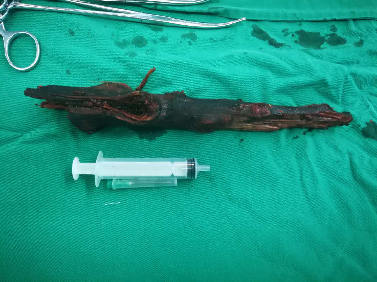李永军主任医师、李新江主治医师、王川主治医师以及骨科宋永周副主任医师合作手术,历时近两个小时,成功将异物取出。术后患者无严重失血表现。7日,急诊外科对患者进行二次清创,放置伤口外敷的负压吸引装置(VSD),目前,伤者生命体征平稳,待进一步观察与治疗。
