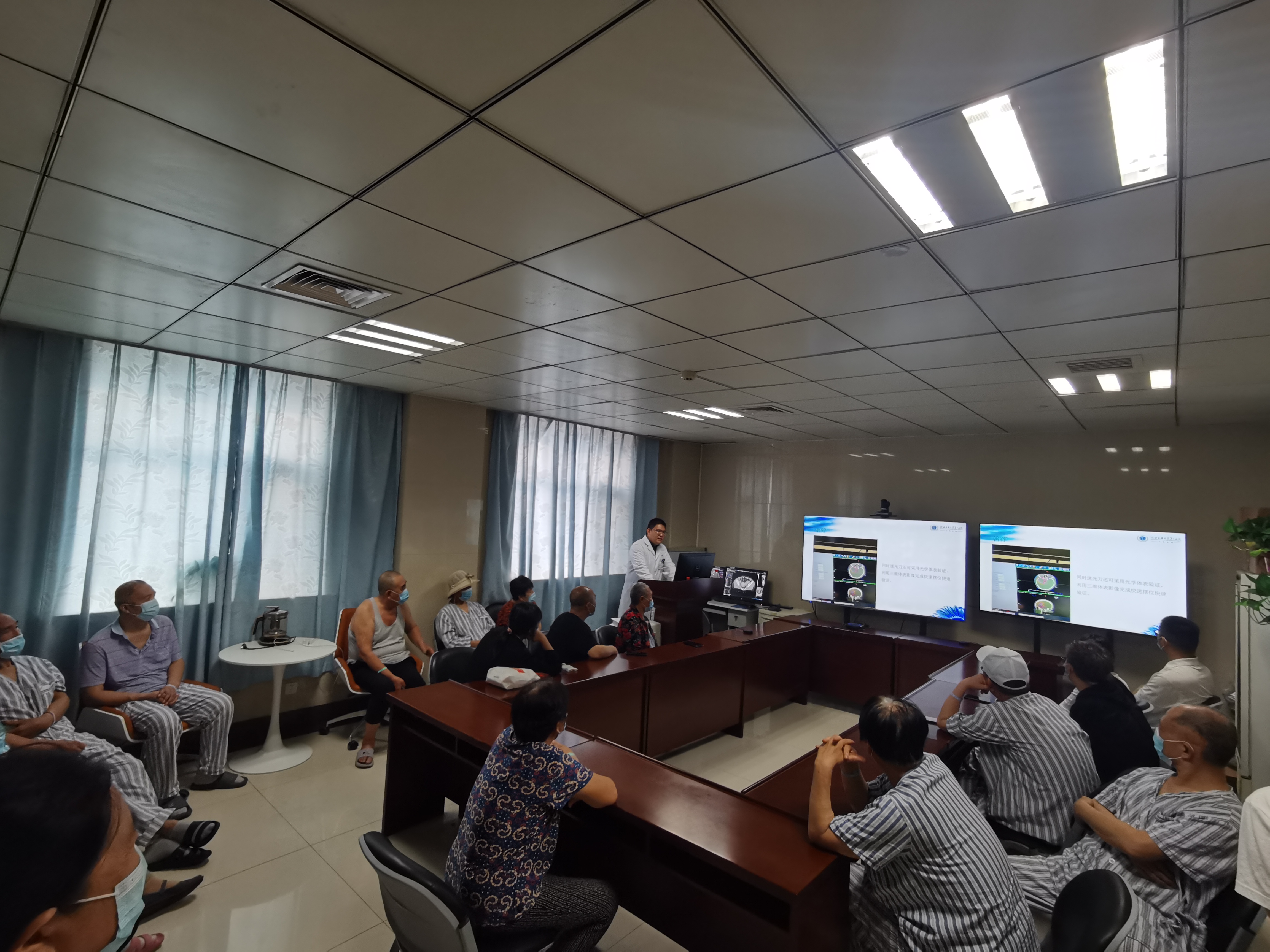 为提升中枢神经系统肿瘤患者及家属对放疗过程的认识,提高治疗依从性,缓解肿瘤患者及家属的焦虑情绪,提高肿瘤患者治疗信心, 6月10日下午,我院四总支八支部放疗科治疗师刘军领为脑瘤患者及家属举办了一场以“放疗水平,靠的是设备,更是匠心精心”为主题的科普宣教活动,向大家介绍了高水平放疗技术除了有高精尖的设备支撑外,更需要将匠心精神贯穿于从体位固定、定位、靶区勾画、计划设计、计划验证、放疗实施乃至设备的质控等等全过程的所有细节中。