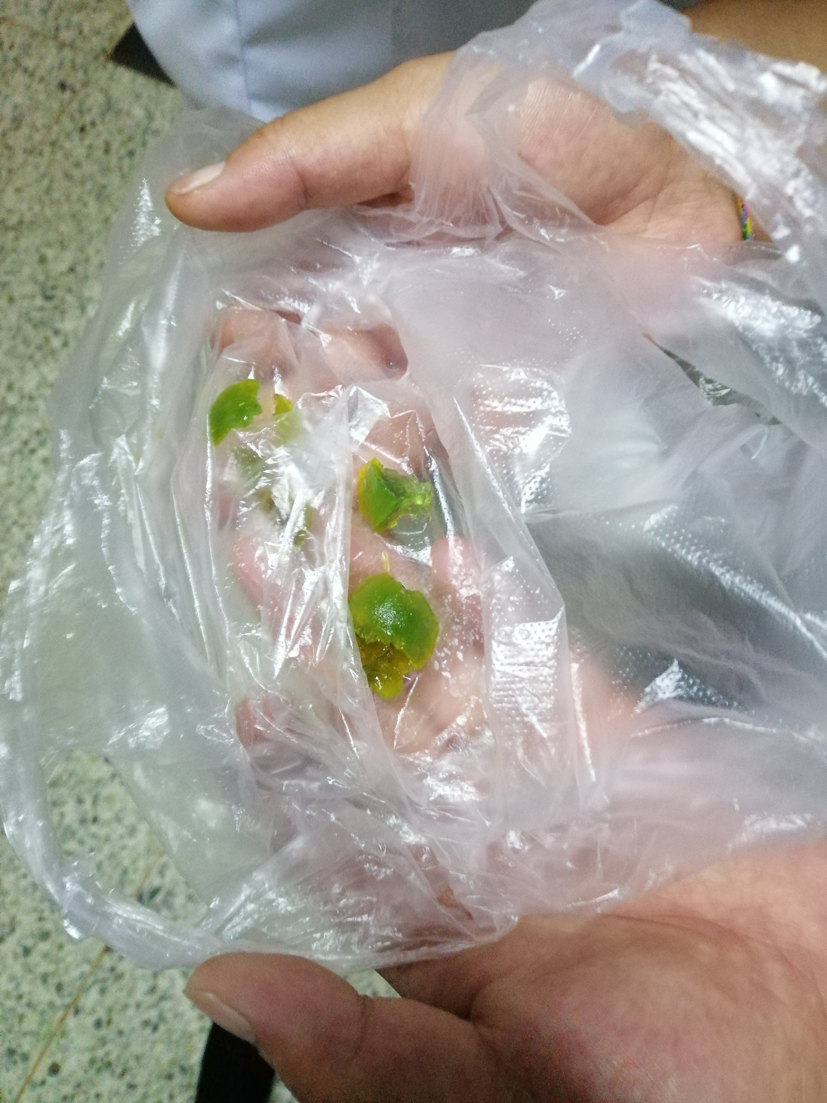经检查患儿腹部B超显示为十二指肠肠壁水肿(考虑异物),但此前家属并未说明患儿有误服异物史,经追问家属才回忆到入院前8天患儿曾误服海绵宝宝(遇水膨胀变大)数粒,家长述曾由患儿口腔抠出4粒,是否吞服及吞服粒数不清楚。李索林主任考虑为异物所致梗阻,遂决定为患儿安排急症手术,而考虑到患儿误服的异物“海绵宝宝”的特性-遇水前直径约2mm,遇水后膨胀可至2-3cm。对于一个1岁宝宝来说,已然算巨大异物。由于异物太大,采取腹腔镜手术方式不能将异物取出。仔细考虑后,决定先尝试用手法捏碎异物,然后促进其排出。在患儿家属同意签字后,于8月1日凌晨,为患儿进行全麻,在超声引导下十二指肠异物手法挤碎术。术中可触及直径约3cm可活动圆形包块,两手将肿物固定于脊柱旁后用力挤压,获得类似挤碎“葡萄粒”感觉后前述包块不能再触及,再次进行超声扫查原球形回声消失。在超声科田晖主任医师和麻醉科路红梅副主任医师的帮助与支持下,手术顺利完成。后送检患儿血液和胃液,未查出有毒药物成分。次日,使用开塞露刺激患儿排便,患儿排出4块绿色的异物碎块,复查超声肠管内未见异物,后逐渐恢复饮食,患儿情况逐渐好转,并顺利出院。