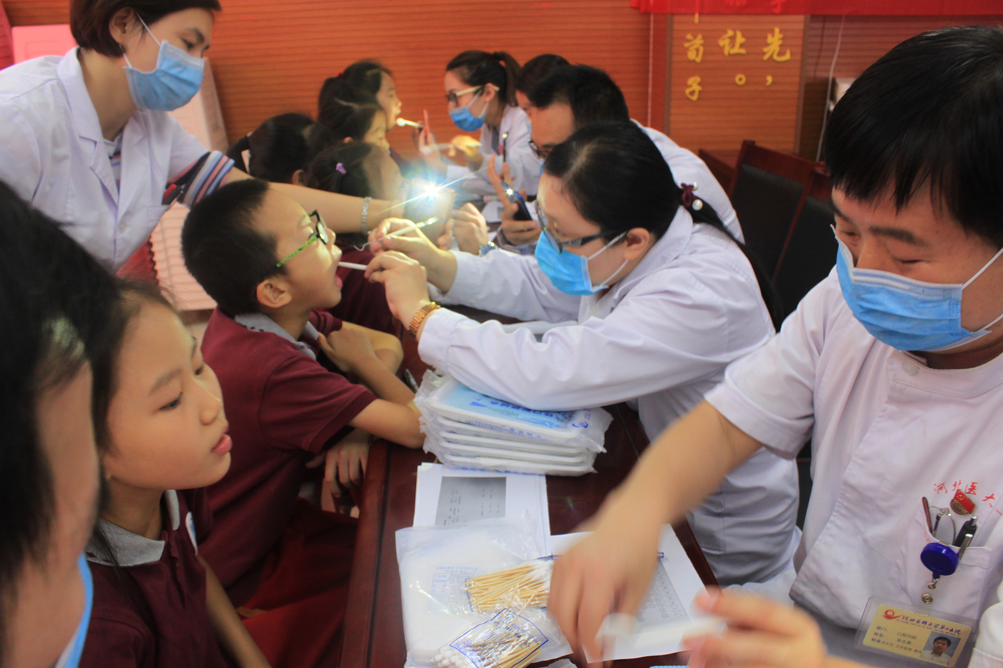 口腔内科张美娟和程冬梅分别,以本次爱牙日的主题“口腔健康,全身健康”,“护健康口腔、助健康体魄、享健康生活”为切入点,向广大学生详细讲解了日常口腔健康的维护方法和基本常识,帮助学生们提高口腔健康意识,建立自我口腔健康行为,营造利于口腔健康的良好环境。随后,大家拿出自备的口腔检查器械对在场的学生逐一进行口腔检查,并填写口腔检查问题表,让学生们了解自己的口腔问题,并给予了指导意见,提高了同学们的爱牙护牙意识。本次口腔保健宣教活动经过大家积极参与,认真筹备,取得了完满成功,达到了预期的效果。