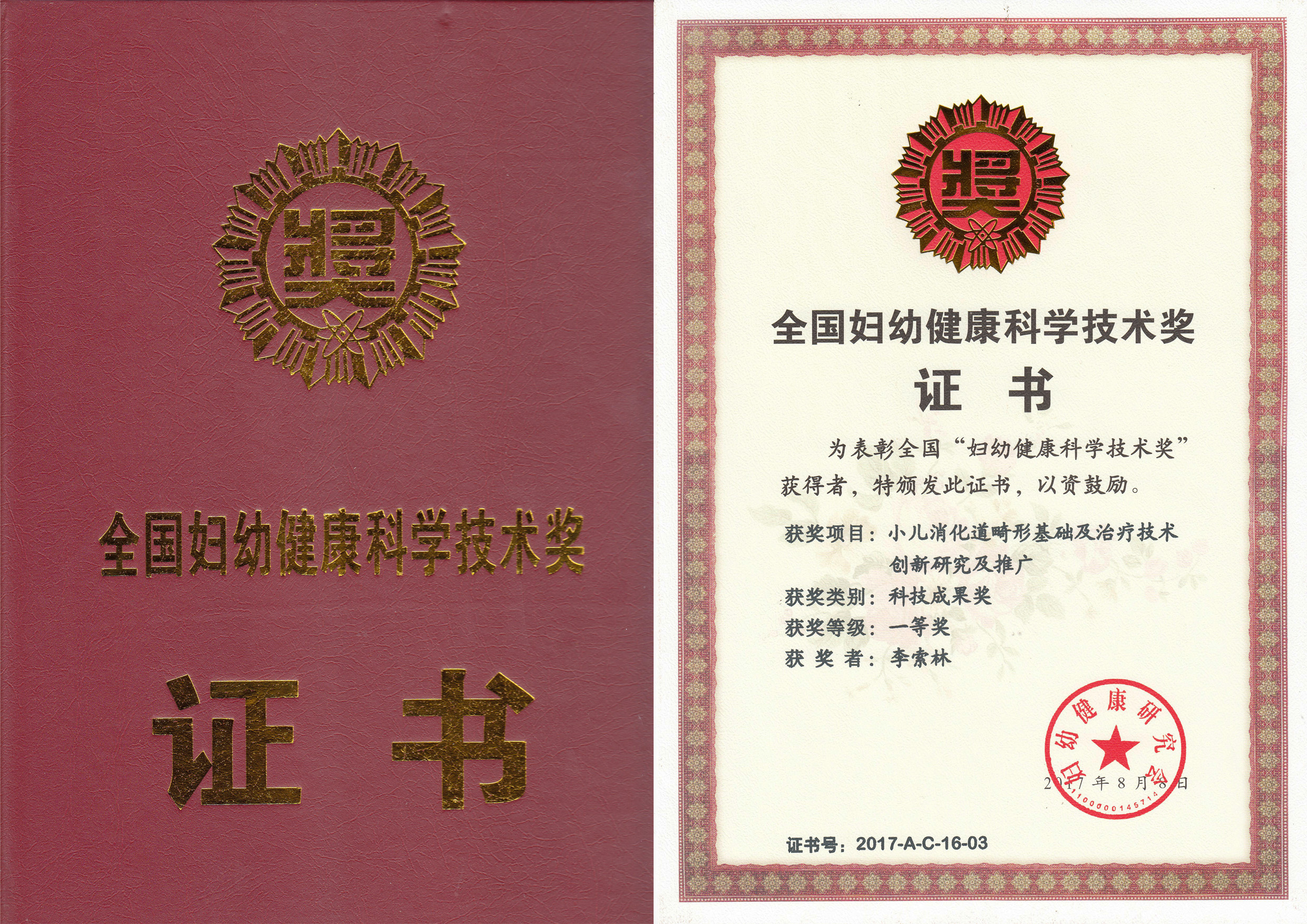 2017年《小儿消化道畸形基础及治疗技术创新研究与推广》获全国妇幼健康科技成果一等奖