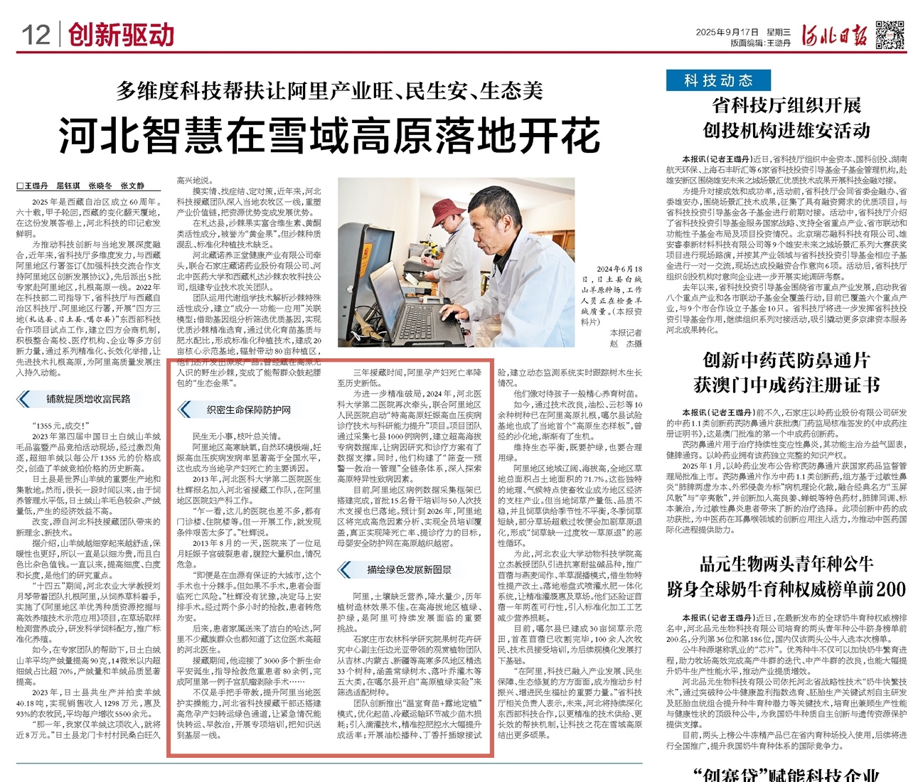 9月17日《河北日报》12版文章《多维度科技帮扶让阿里产业旺、民生安、生态美——河北智慧在雪域高原落地开花》对我省科技帮扶西藏阿里地区事迹进行了报道,其中“织密生命保障防护网”章节介绍了我院援藏贡献。 ...