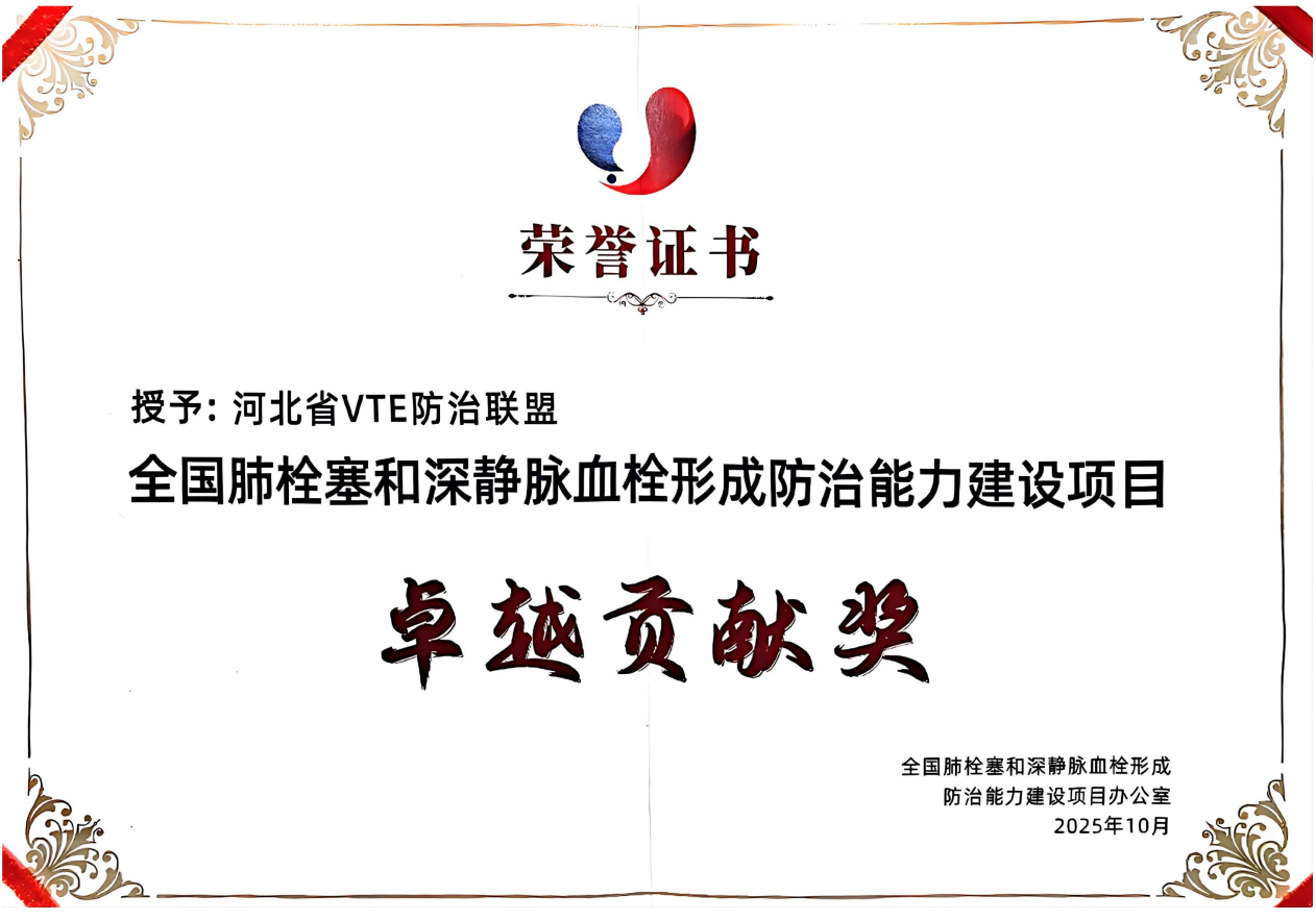 近日,我院静脉血栓栓塞症(VTE)防治工作再结硕果,在中国医师协会2025年全国肺栓塞与肺血管疾病学术会议上被评为优秀参研单位,获得国家VTE防治项目办公室评选的全国肺栓塞和深静脉血栓形成防治能力建设项目“卓越...