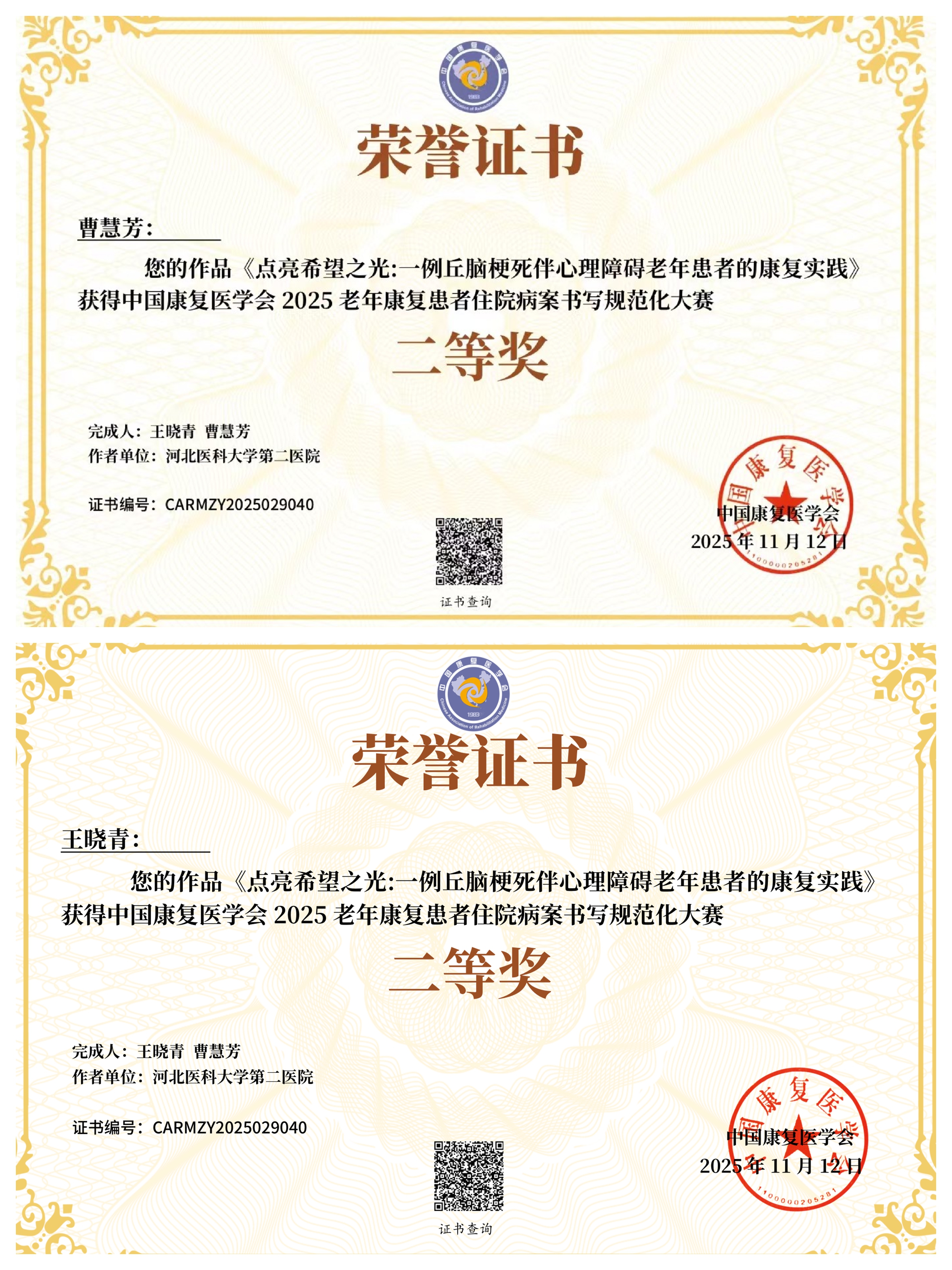 近日,由中国康复医学会老年康复专业委员会主办的“2025年老年康复患者住院病案书写规范化大赛”圆满落幕。我院康复一科曹慧芳、王晓青医师凭借扎实的专业功底,从全国46份参赛病历、14支入围决赛队伍中脱颖而出,荣...