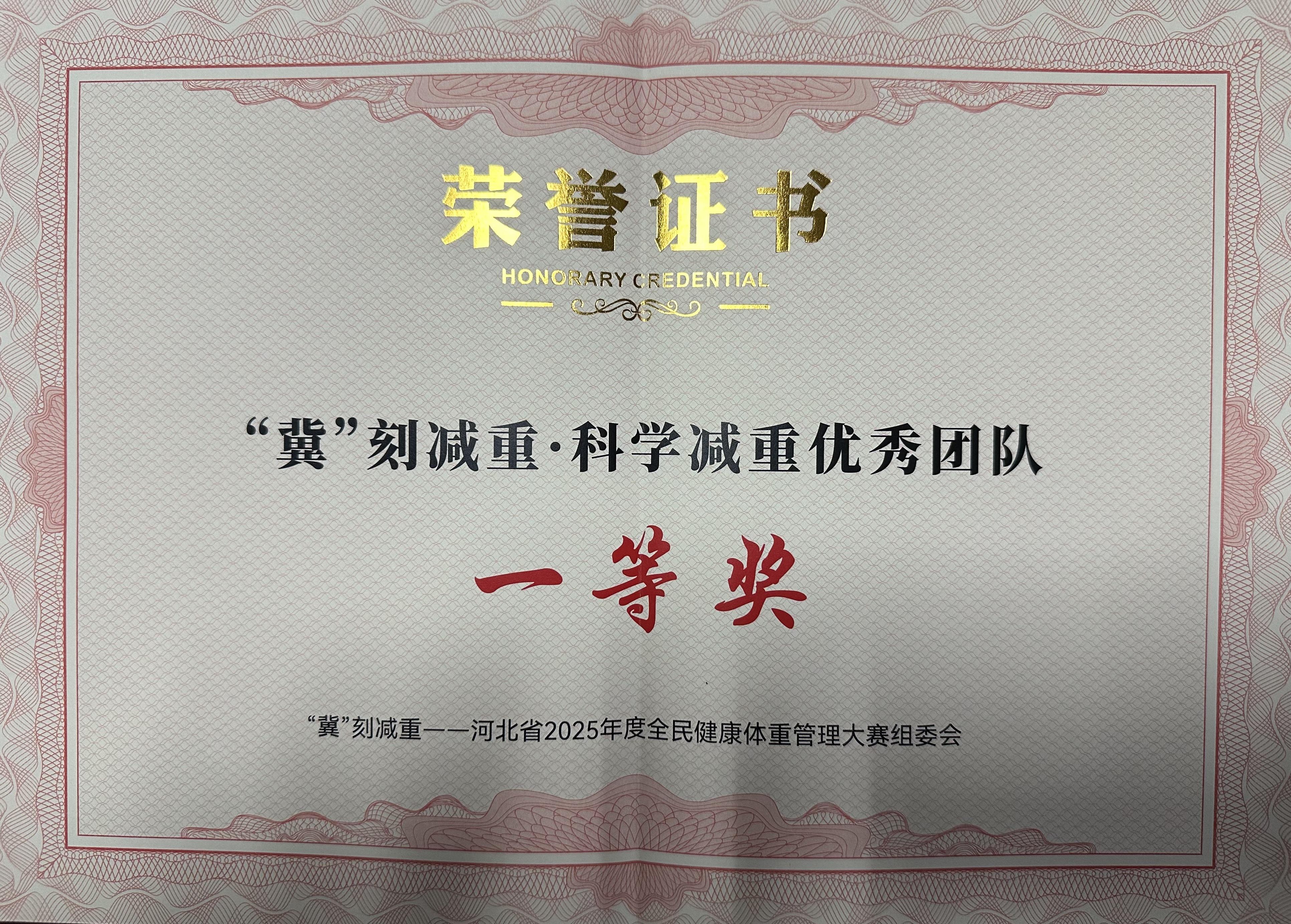 近日,“冀刻减重”河北省2025年度全民健康体重管理大赛圆满落幕。我院凭借在体重管理领域规范化的诊疗模式、科学化的干预手段和精细化的服务体系,荣获“科学减重优秀团队一等奖”。 本次大赛中,我院作为省级体重...