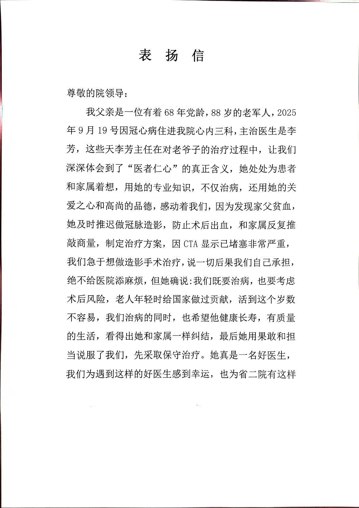 致心内三科郝玉明主任、刘金明主任及李芳医生的感谢信