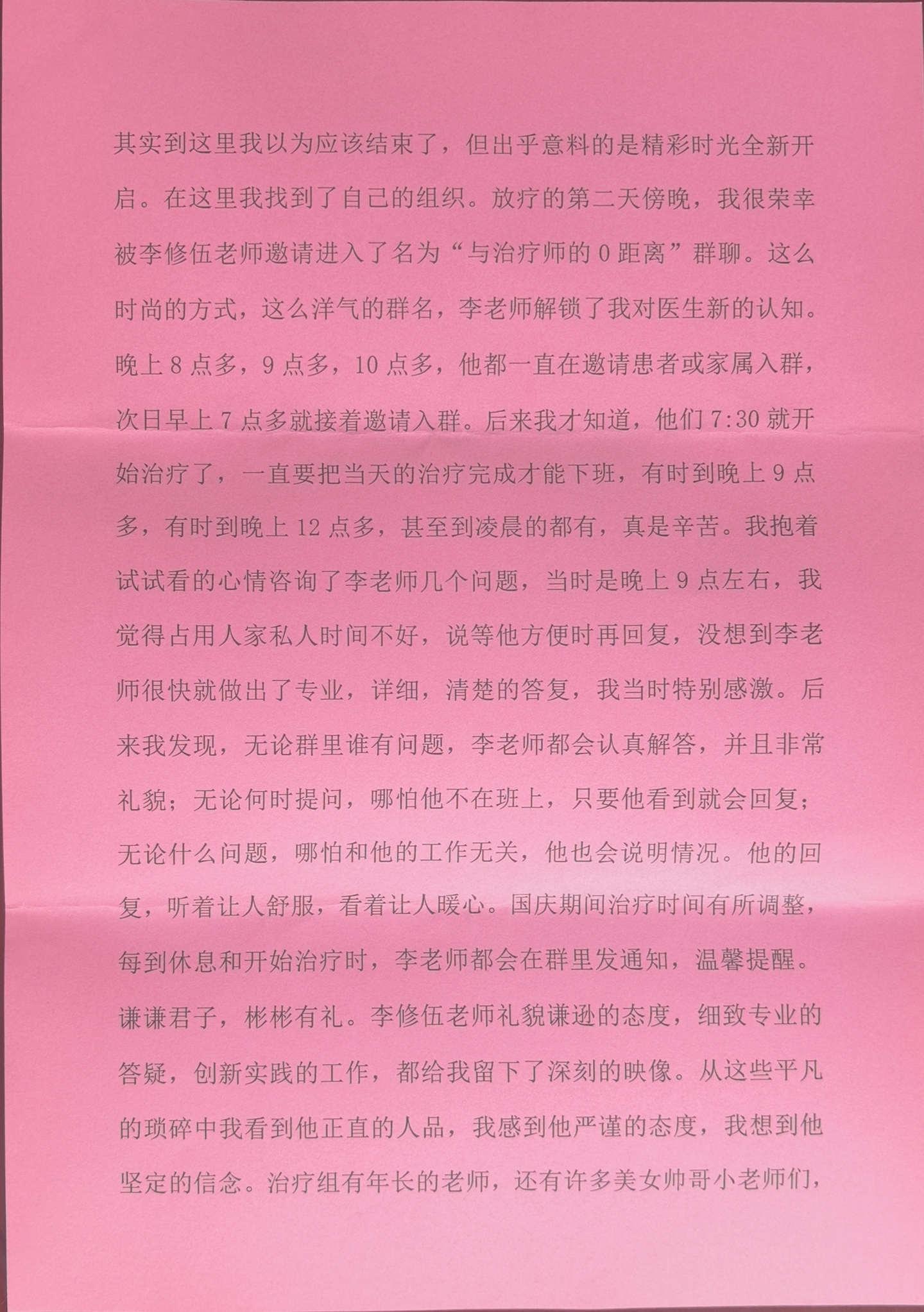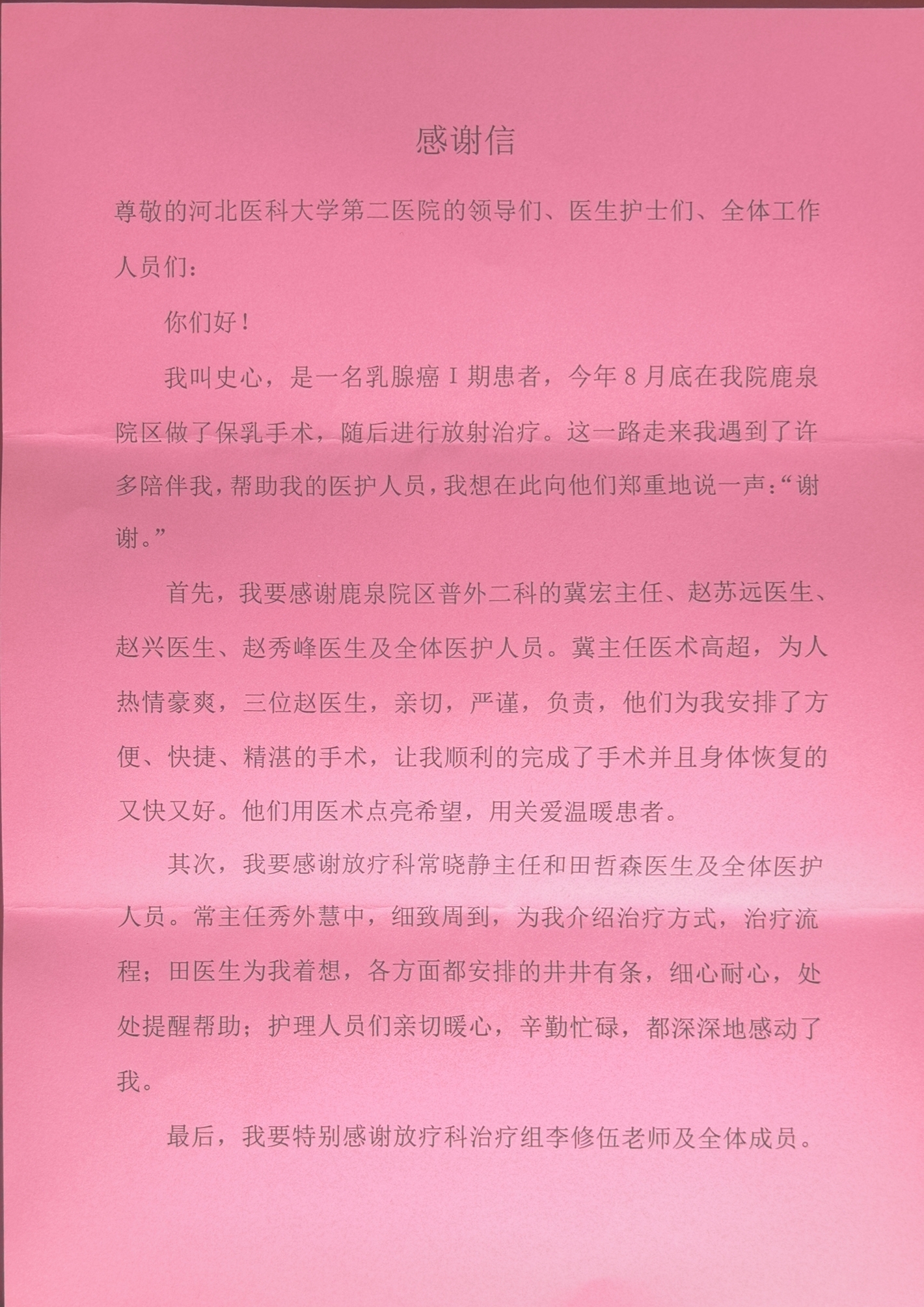 致鹿泉院区普外二科冀宏主任、赵苏远医生、赵兴医生、赵秀峰医生及全体医护人员和放疗科常晓静主任、田哲森医生、李修伍医生及全体医护人员的感谢信