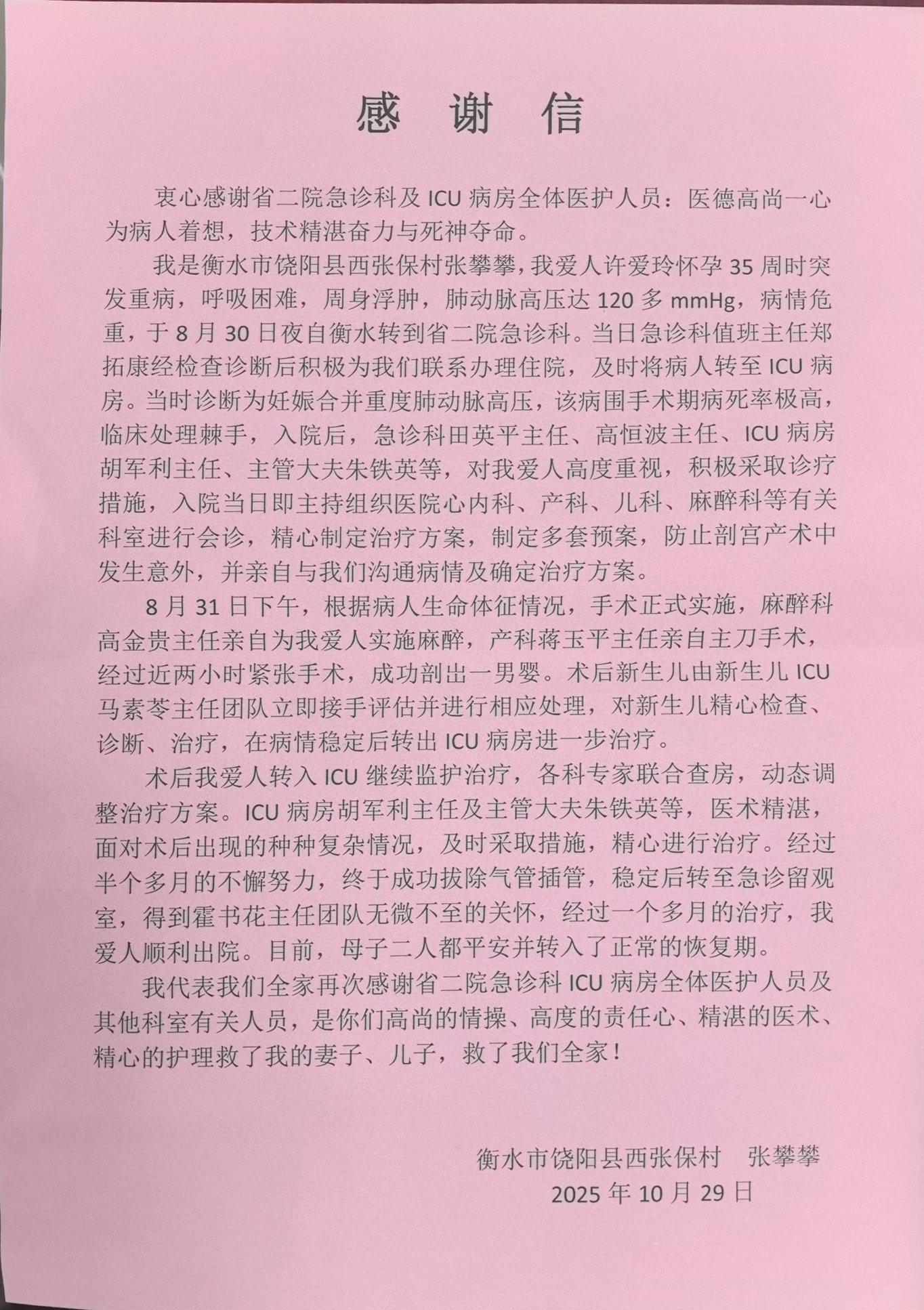 致急诊科田英平、郑拓康、高恒波、胡军利、霍书花、朱铁英及全体医护人员和麻醉科高金贵、产科蒋玉平、新生儿ICU马素苓及其团队的感谢信