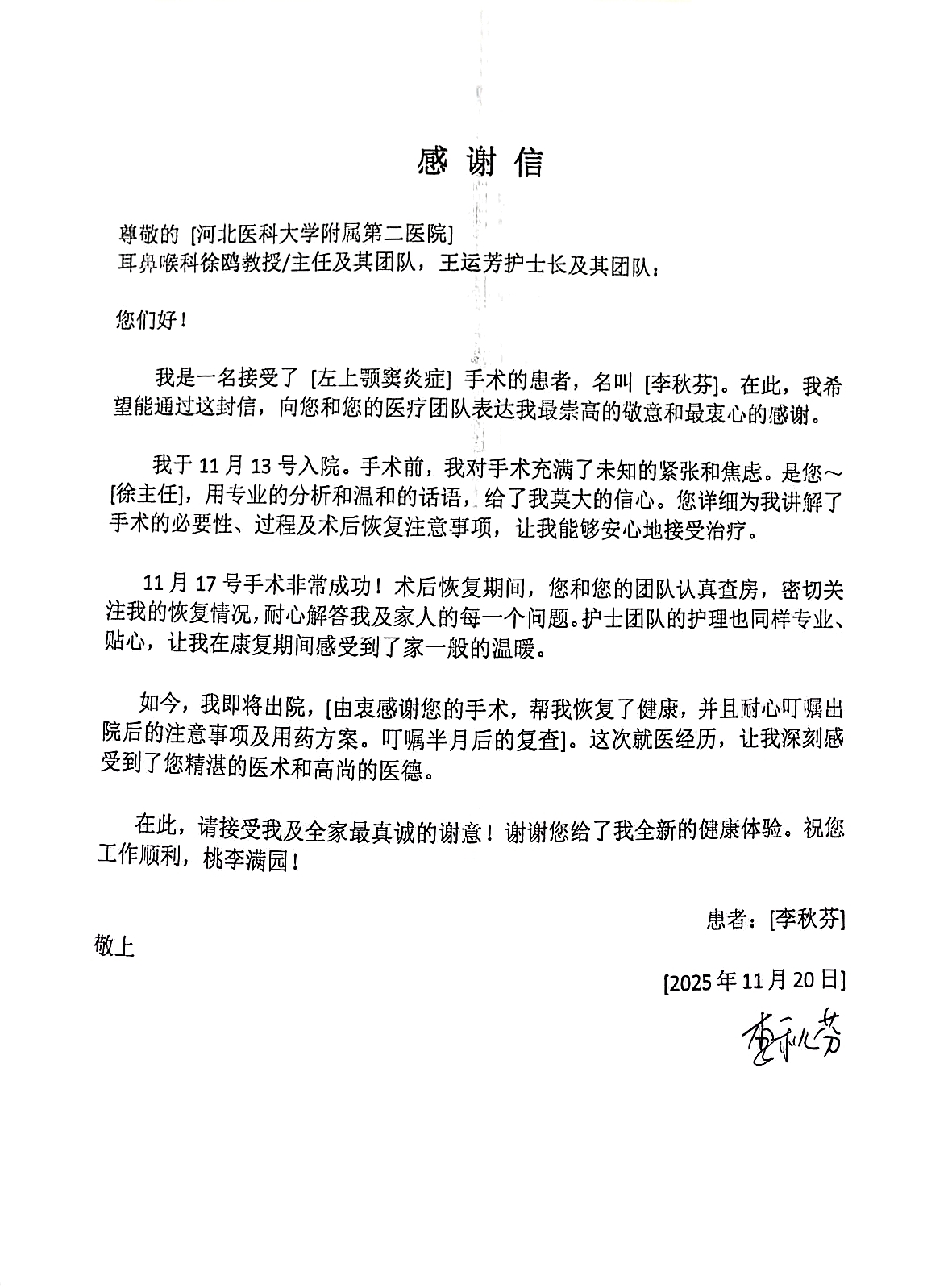 致耳鼻喉科徐鸥主任及其团队、王运芳护士长及其团队的感谢信