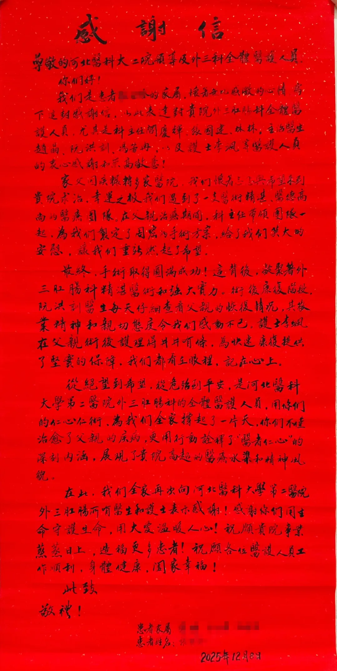 这声感谢,是对普外三科护理团队"叙事护理"实践的最佳注解:我们书写的,不仅是医嘱的执行记录,更是与患者并肩作战、共渡难关的故事。每一次鼓励、每一声安慰,都是叙事的一个篇章,最终汇成一首关于生命重塑的康复诗篇。患者和家属的肯定激励着我们,继续以精湛技术和仁爱之心,为每一位"张叔叔"铺设那条从疾病通往新生的"康庄大道"。
