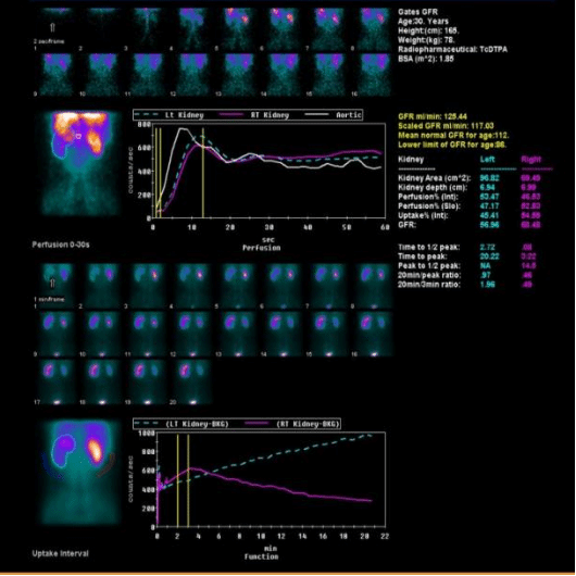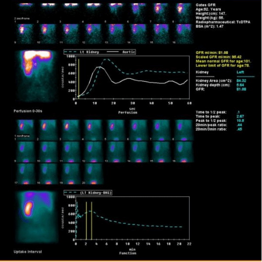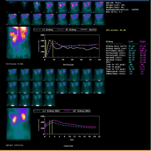 静脉注射经肾小球滤过或肾小管分泌的显像剂后,用核医学成像设备快速动态采集,获得肾脏血流灌注影像、肾实质影像,随后显像剂随尿液流经肾盏、肾盂和输尿管到达膀胱的序列影像,来观察肾脏的位置、大小、形态、功能和上尿路通畅情况,特别是能定量测定分肾功能(左、右肾的各自功能)。