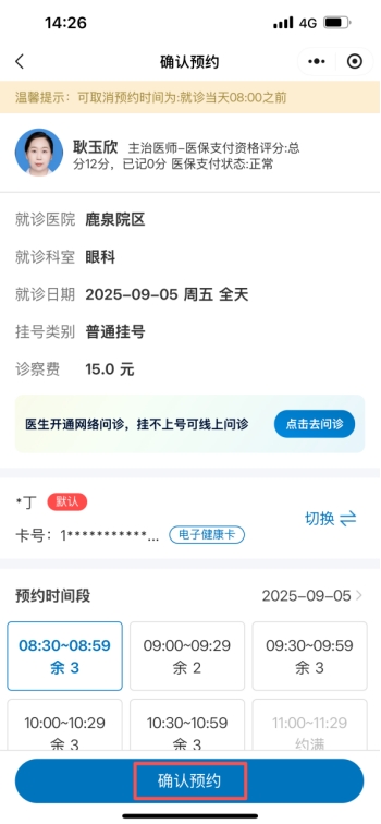 3. 选择科室和医生点击确认预约