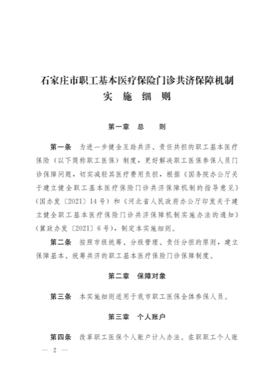 为进一步健全互助共济、责任共担的职工基本医疗保险(以下简称职工医保) 制度,更好解决职工医保参保人员门诊保障问题,切实减轻其医疗费用负担,石家庄市人民政府办公室印发《石家庄市职工基本医疗保险门诊共济保障机制实施细则》,2022 年1月1日正式执行。