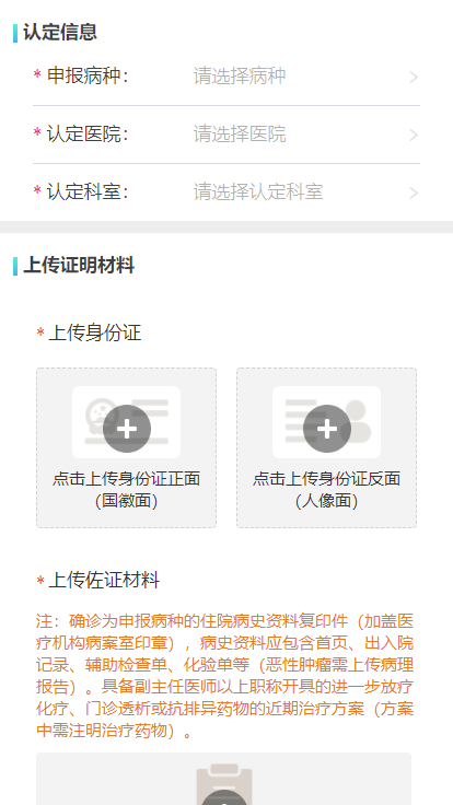 STEP10上传身份证、医院盖章后的《备案表》及所申报病种的佐证病历资料(包含首次确诊病历首页、出入院记录、手术记录、辅助检查单、化验单,恶性肿瘤需上传病理报告、诊断证明、申报药品所需相关证明材料等)。信息确认无误后,线上提交,即可完成申报。