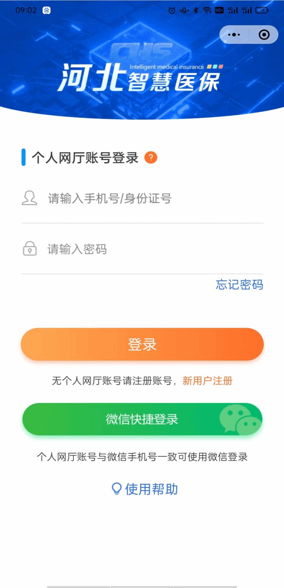 STEP01关注微信小程序“河北智慧医保”(可扫码)进行申报,进入申报平台首页,登录(初次使用需要新用户注册)。