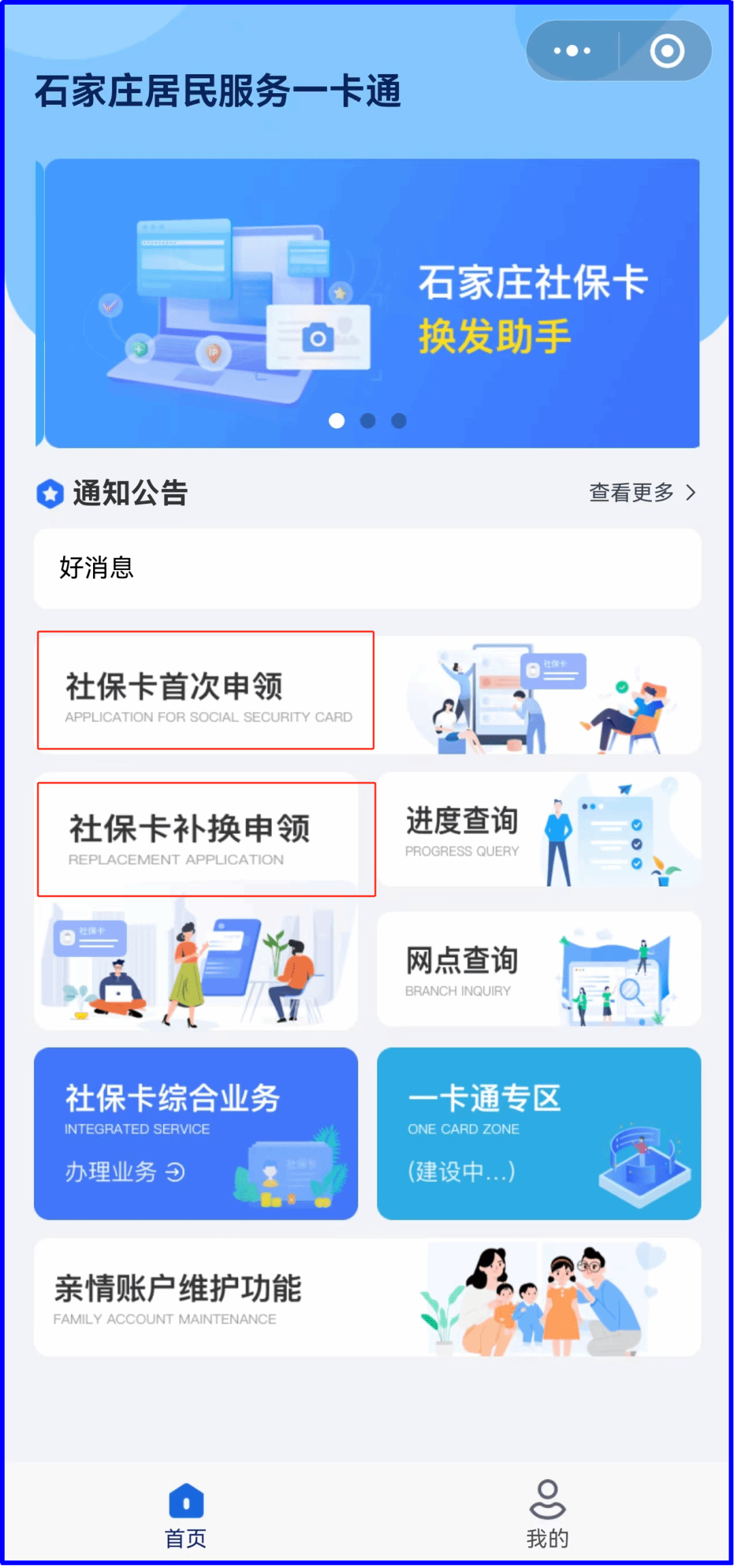 在石家庄,通过微信公众号或者小程序“石家庄社会保障卡”,可以足不出户线上办理社保卡挂失解挂、密码修改重置、首次申领、补换卡业务啦!办理方式如下: