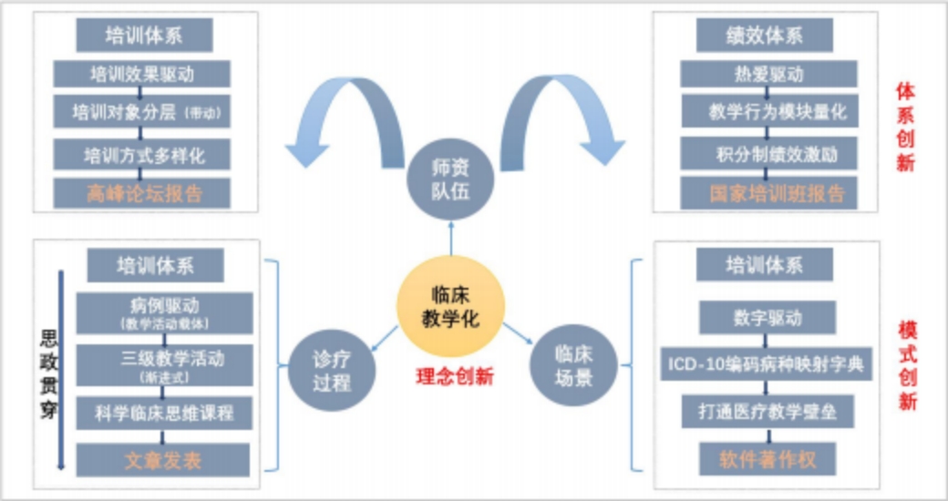 基于工作场所与成人学习理论,经长期教学实践检验,突破“医疗为主,教学为辅”传统观念,创新性提出体现临床专硕教育特点的“临床教学化”理念,具有毕业后教育特色。该理念通过“理念提升+夯实基础+以赛促建+智慧赋能 ”四阶段,融入“培训+考核+质量+绩效+保障”五体系创新建设中,促进临床场景教学化、诊疗过程教学化、师资队伍教学化“三转化”,为专硕培养的“融入临床、化践为教、精准育能”提供方向指导和理论依据。