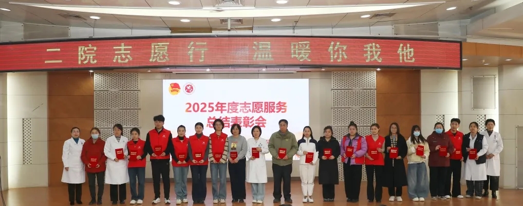 在第40个国际志愿者日来临之际,我院以“二院志愿行 温暖你我他”为主题,召开2025年度志愿服务表彰工作会,总结志愿工作成果,表彰先进典型,进一步凝聚志愿力量。团省委志愿者工作部周永森,医院相关职能部门负责人、党总支书记及各领域志愿者代表100余人参加会议,领取到医院2025年度志愿服务纪念章。