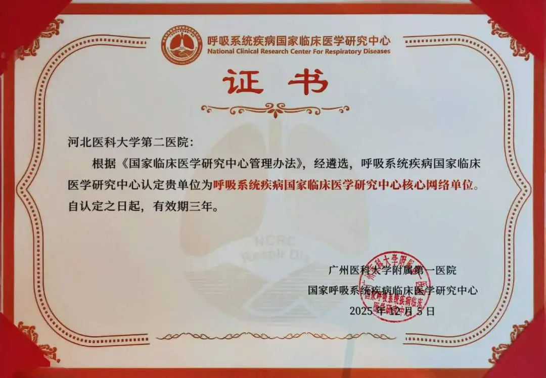 12月5日,经过严格的核验与综合评审,我院以优异成绩再次获授“国家呼吸系统疾病临床医学研究中心核心单位”称号。这标志着我院在呼吸系统疾病领域的研究与诊疗水平稳居国内先进行列。