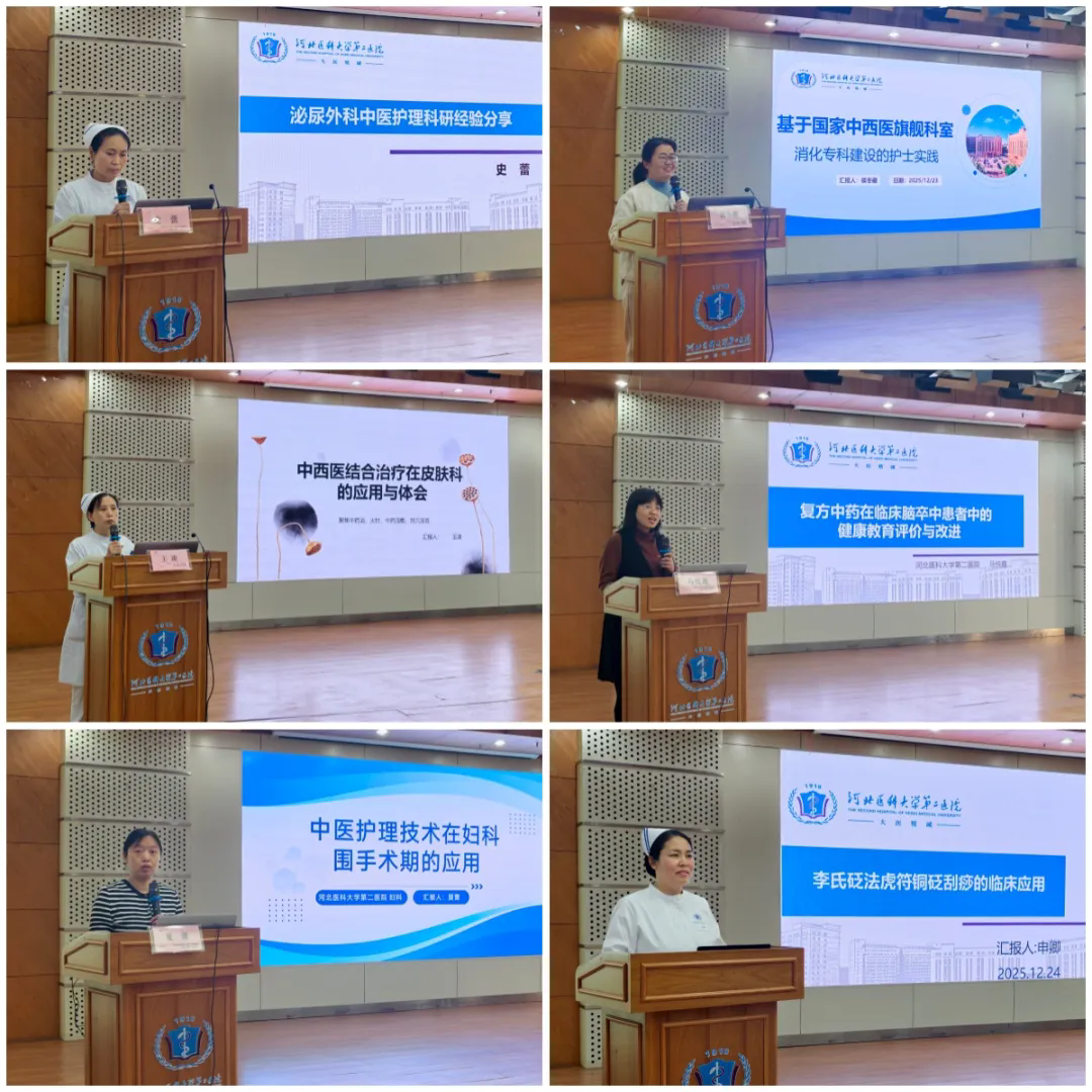 泌尿外科史蕾副护士长系统讲解了从科研选题到论文发表的完整路径;消化内科侯冬藏副护士长分享了科室结合耳穴贴压等中医技术助力患者康复的实践;皮肤科王凌护士长通过案例展示了中药浴、火针等技术在控制症状、减少复发方面的优势;神经内科马悦霞护士长介绍了复方中药在脑卒中护理中的应用与健康教育;妇科夏蕾副护士长详解了耳穴压豆、热奄包等技术在围手术期缓解疼痛、助眠的实践;鹿泉院区重症神经外科申卿老师则介绍了李氏砭法刮痧以“通”为核心的无创护理方案等。