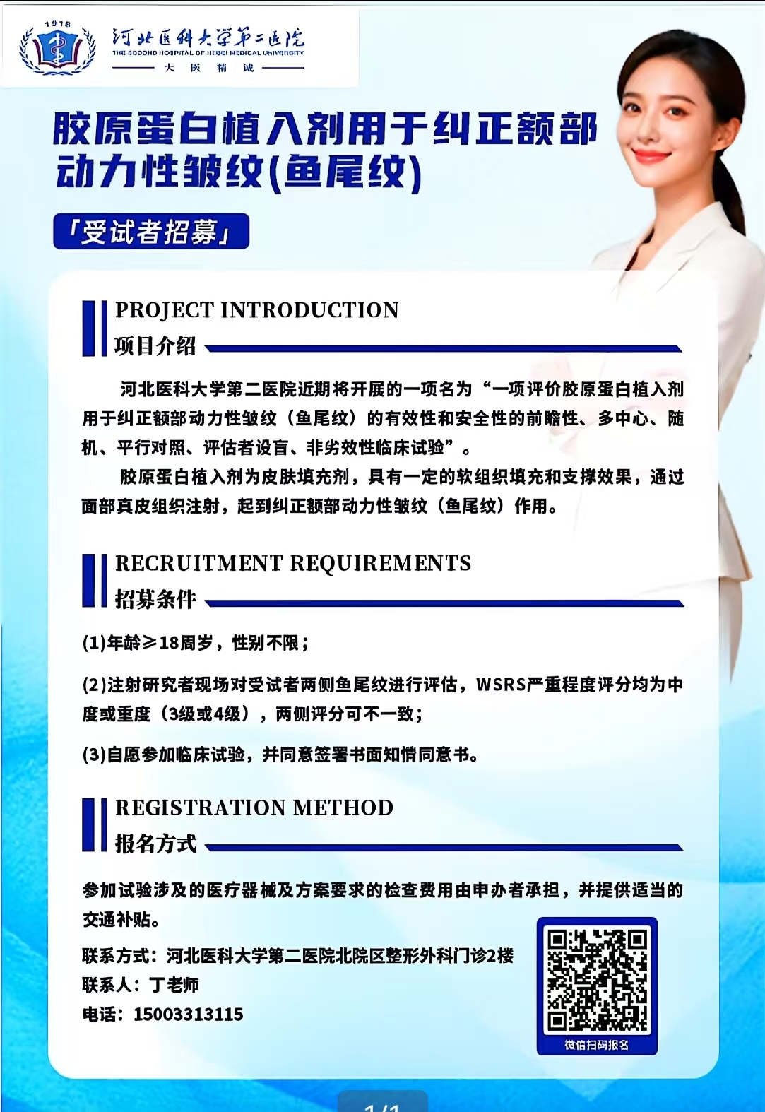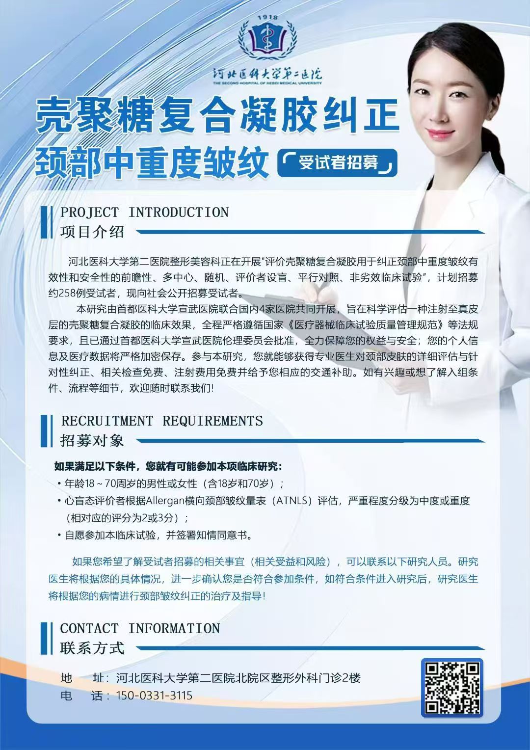 招募鼻唇沟皱纹、鱼尾纹、颈纹临床试验受试者