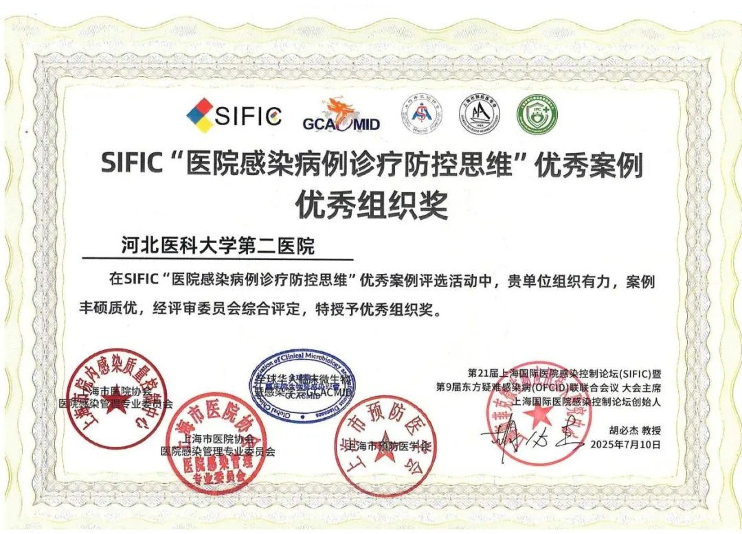 在第21届上海国际医院感染控制会议、全球华人临床微生物暨感染学会学术年会上,我院报送的4份“医院感染病例诊疗防控思维”案例从全国218份案例中脱颖而出,其中《1例口底鳞状细胞癌术后深部切口感染的调查》《 1例胰十二指肠切除术后腹腔感染案例分析》荣获三等奖,《1例脑出血患者的诊疗与VAP分析》和《肾移植术后深部手术切口感染继发多部位感染的案例分析》获优秀奖,我院荣获优秀组织单位奖。