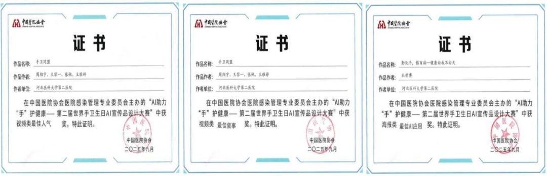 在第二届世界手卫生日AI宣传品设计大赛上,我院从400余作品中成功突围,《手卫同盟》获得AI视频类最佳人气奖、最佳叙事奖;《勤洗手,镇百病—健康由我不由天》获得海报类最佳AI应用奖。